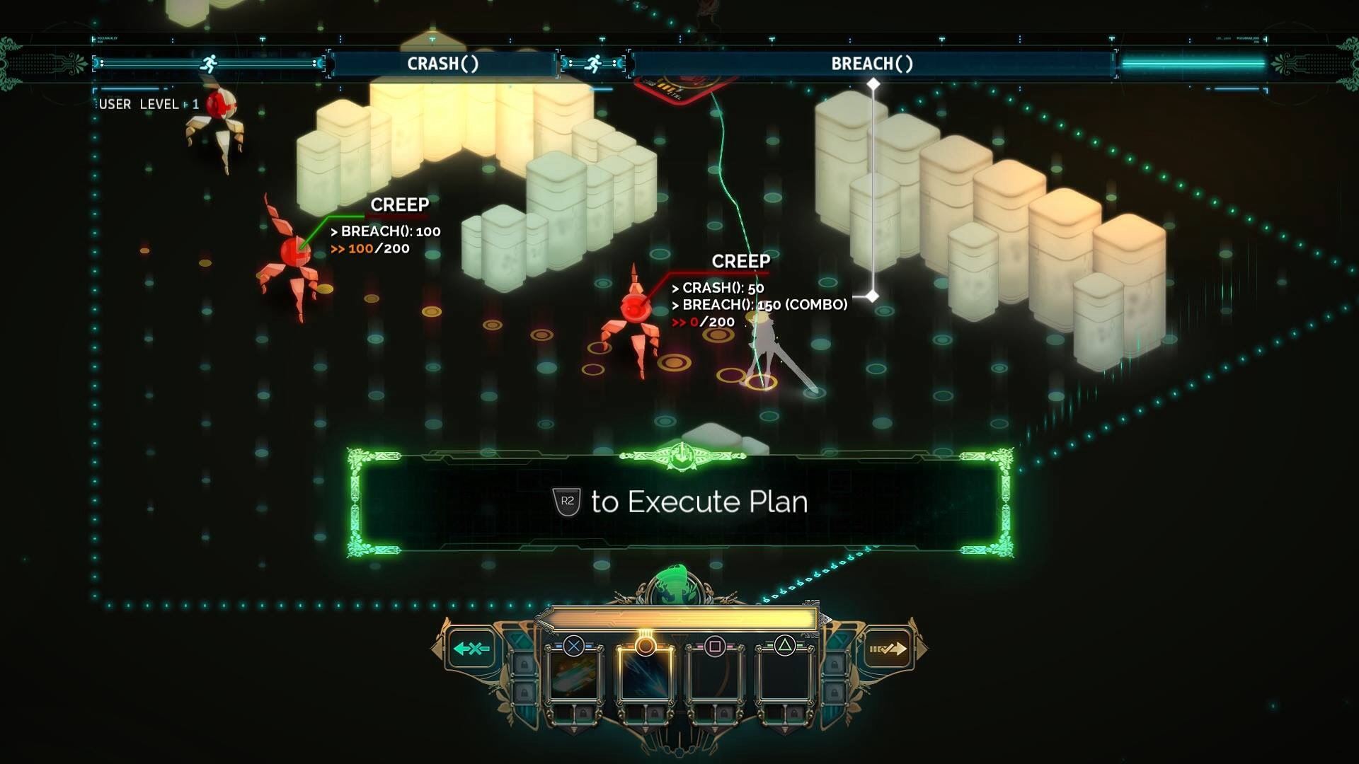 Una vez que arranca el Proceso, tenemos algunas opciones de ataque: desplegar nuestro arsenal golpe tras golpe, correr hacia los enemigos y recibir daño en tiempo real, o activar nuestro turno. He aquí el arte y belleza de aporrear a los mugres robots, ya que el piso se tornará negro y con puntos, para que nos sirvan de referencia en el lugar donde están los droides y uno mismo.