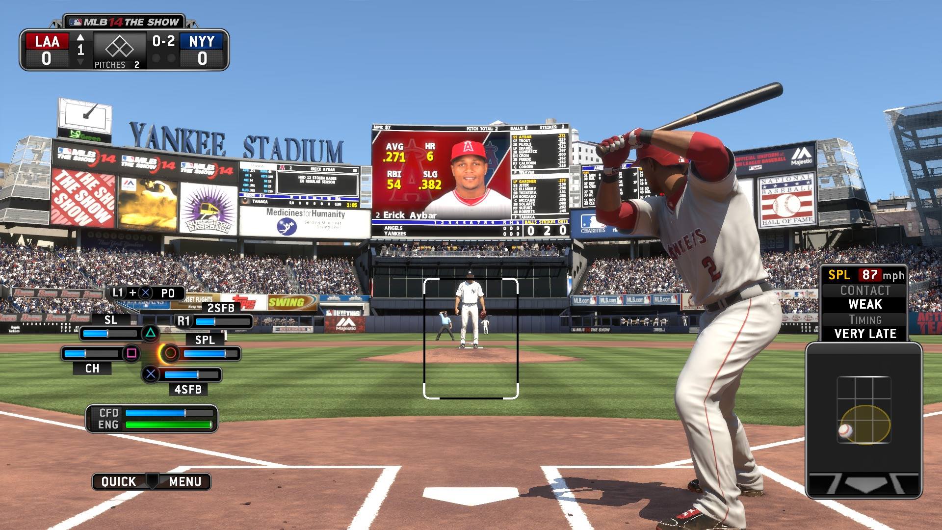 Siguiendo con los pitcheos, los estilos en MLB 14: The Show siguen siendo iguales, pudiendo escoger los botones físicos o tocando la pantalla en la PS Vita para agregar exactitud a la ubicación con respecto al efecto. Similar también son las modalidades de los controles, usando ambos joysticks para dar ubicación y fuerza a la pelota, o presionando X si queremos utilizar el modo de toque, que consiste en atinar al presionar el botón cuando un círculo negro abre y cierra dentro de la probable ubicación de la bola. Ambos modos son difíciles de dominar pues requieren concentración y no hay manera de definir cuál es más práctico, solo cómodo.