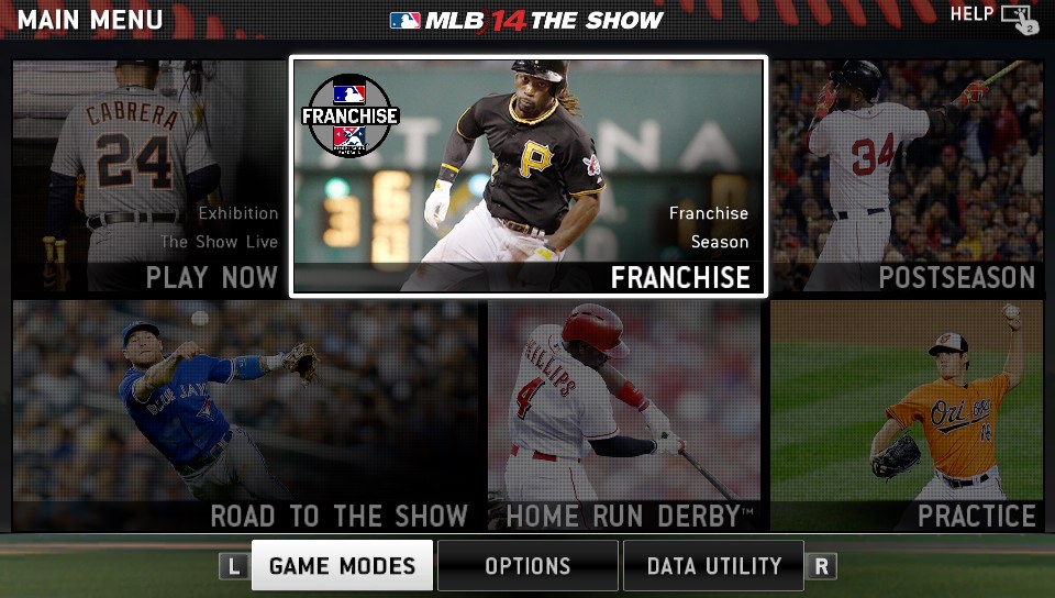 MLB 14: The Show mantiene prácticamente las mismas bases del año pasado, tratando de no modificar bruscamente para que el usuario se sienta lo más familiarizado posible, incluso la tipografía es la misma. Sin embargo, el primer cambio notable viene el diseño del menú, con una especie de foto mural relativo al deporte, con cuadros que fungen como botones para activar las opciones disponibles.