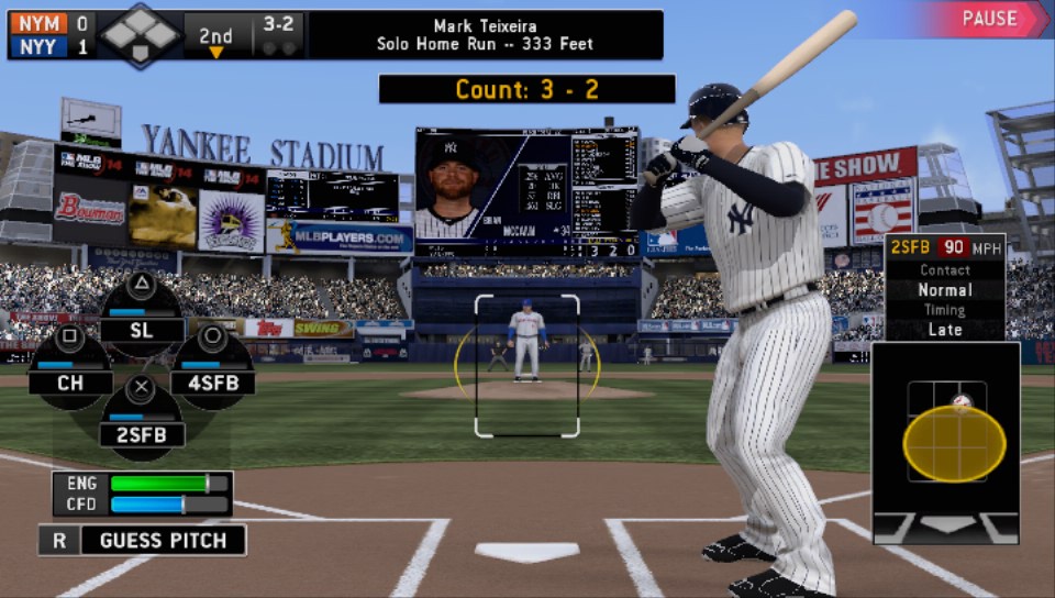El béisbol es un deporte de reacciones muy rápidas -aunque digan que es de gordos- por la velocidad que alcanza la bola desde que es lanzada hasta que es atrapada o bateada. En MLB 14: The Show trataron exitosamente de plasmarlo con el control en tus manos. Este año el juego viene con una ligera mejora de la nitidez de la redonda, pues es más notorio desde que abandona la mano del pitcher y hasta que llega al plato, haciendo más fácil anticipar el tipo y ubicación.