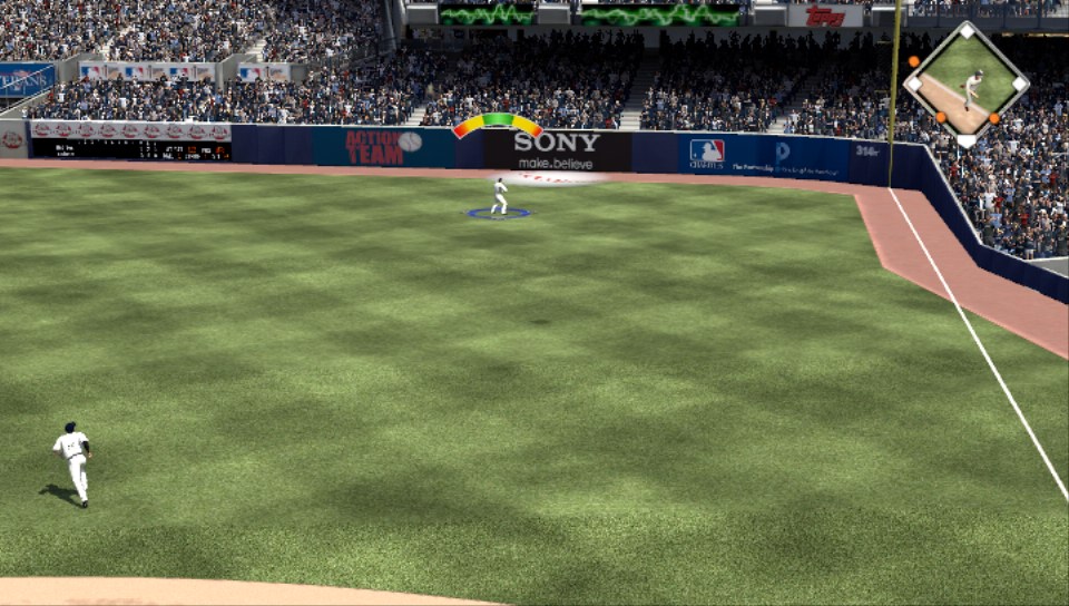 Hace unos párrafos, hablamos de la animación en el lanzamiento y que se mantenía igual, pero la mecánica sí mejoró. Ahora existe un medidor iluminado gradual en rojo-verde-rojo que requiere mantener presionado el botón X antes de que la pelota sea atrapada por el jugador, y soltarlo cuando la aguja alcance la parte media del color verde para asegurar precisión. Deberemos de tener cuidado con los tiempos: muy tarde y el lanzamiento no llegará en buen momento para hacer el out, o muy temprano y soltará la bola. La precisión depende del medidor, pero también de la habilidad del que lanza, pues no es genérica.