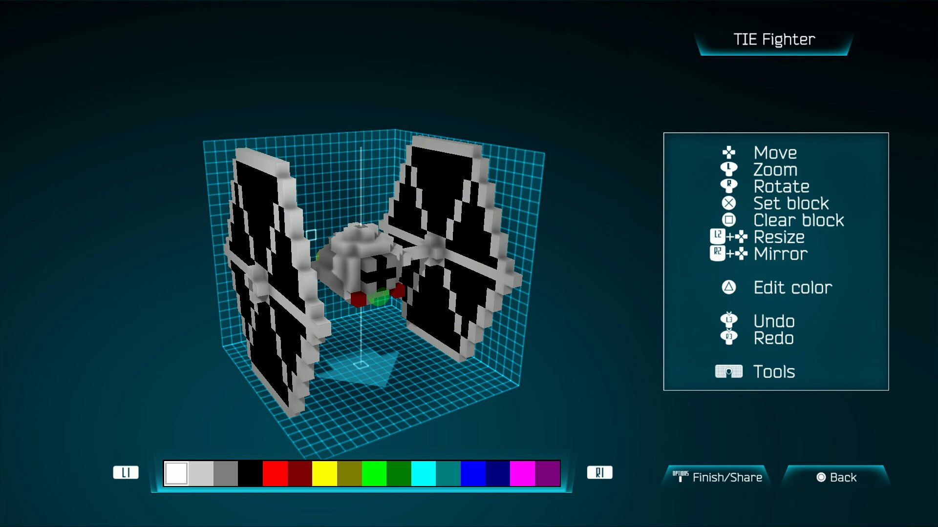 Para empezar en el menú principal vemos que ya tenemos disponible una de las principales mejoras, un edito de naves para poder diseñar aquel vehículo espacial que siempre quisimos ver, o de plano lo que muchos usuarios alrededor del mundo han hecho, crear “naves” con la forma de Mario Bros. o el X-Wing de Star Wars, incluso vi el pájaro odioso de Flappy Bird. En este editor tendremos una cuadrícula tridimensional con un puntero en medio, el cual es nuestra brocha, pues con ese colocaremos un cubito, o lo quitaremos. Podremos hacer tan ancho y alto el puntero para colocar tantos cubos como queramos a la vez y no estar uno por uno. Podremos cambiar el color cuantas veces necesitemos y nos ayudaremos de los joysticks para mover la cuadrícula a nuestro gusto y observar que vayamos bien en la loca idea que nos propongamos hacer.