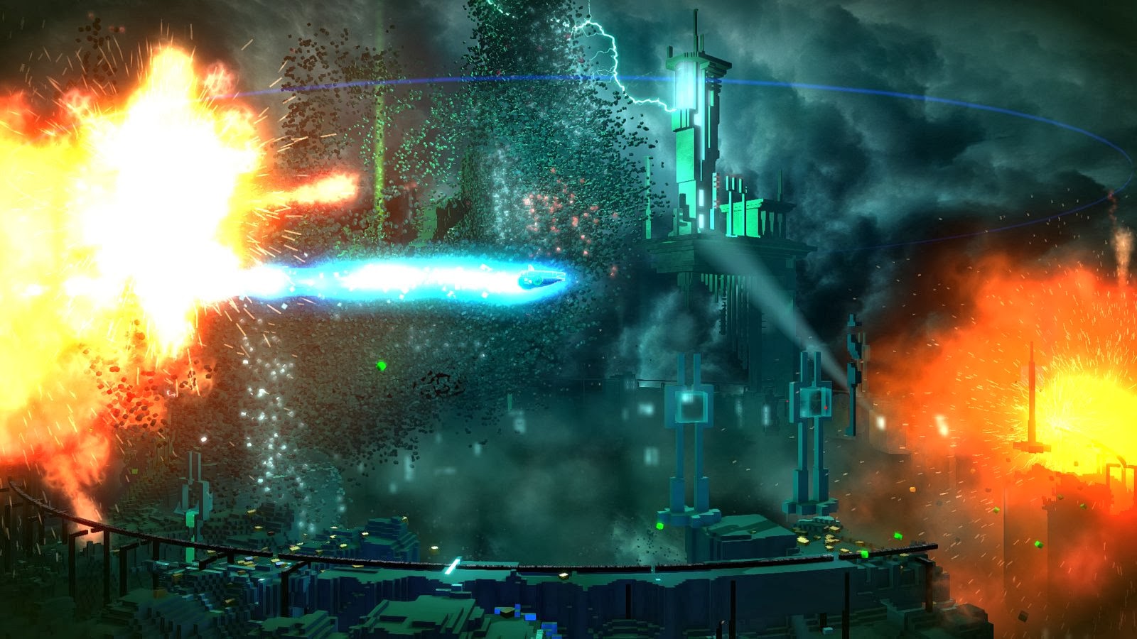 Las colonias galácticas son cinco y cada una representa un nivel de juego diferente. El salto en dificultad es muy marcado pero a partir de la tercera ya ni se siente lo duro sino lo tupido. Acis, Ceres, Decima, Febris y Mefitis son los nombres de los planetas que estaremos visitando. El diseño gráfico de ellos es increíble, con detalles que tal vez no sean muy notorios por la batalla pero que al poner atención nos daremos cuenta de lo genial que lucen. Hay que agregar que Resogunbasa sus principios gráficos en bloques y así lo hace con todos los elementos del juego: naves, humanos, edificios y jefes finales, por lo que al eliminar a alguno los restos serán miles y hasta millones de cubos.