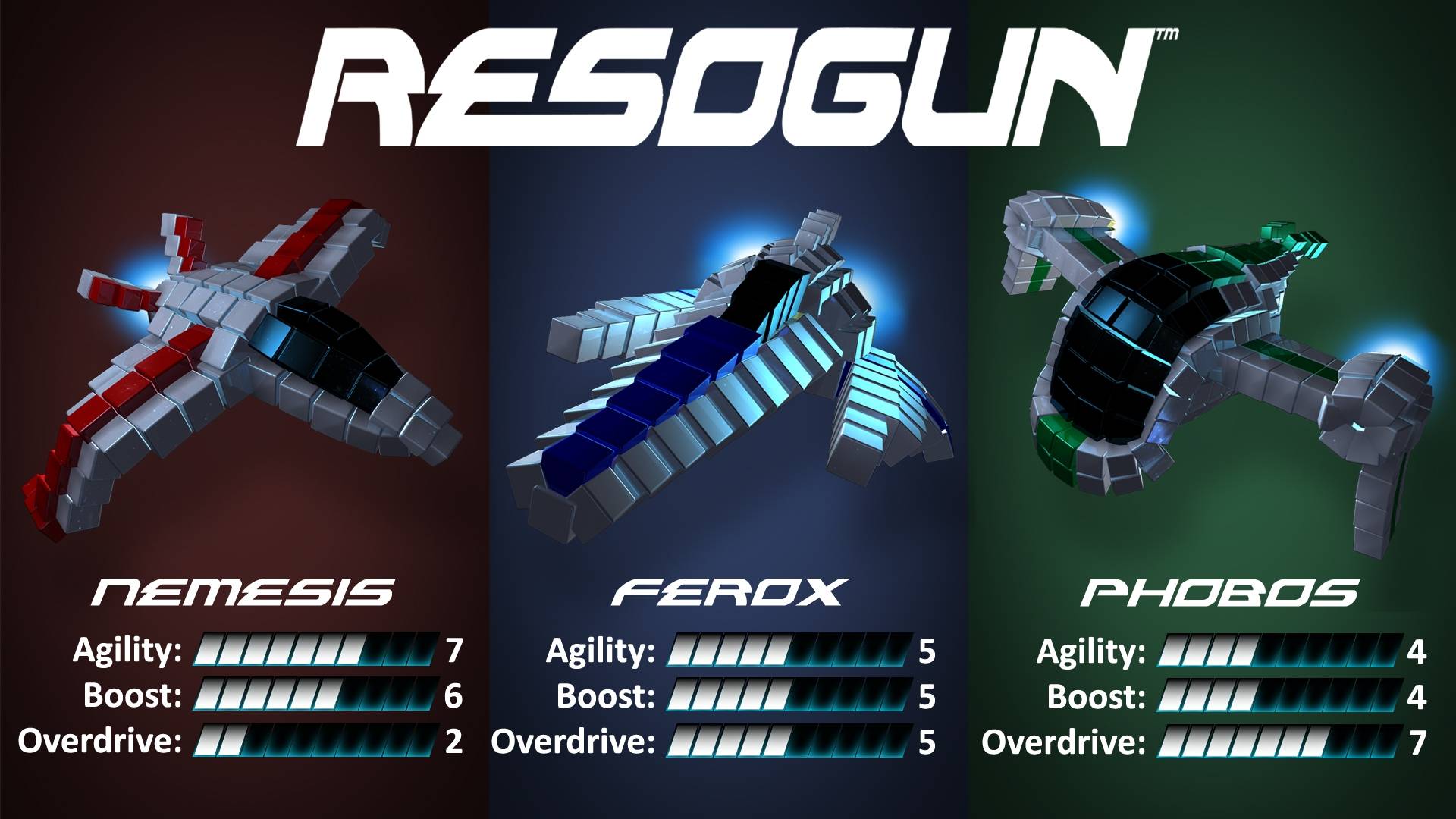 Es obvio que no nos mandan a la guerra desarmados. Contamos con tres opciones de naves que varían en velocidad y potencia: Nemesis, Ferox y Phobos. Creo que las dos primeras son las mejores; Nemesis por su hermosa manera de disparar y Ferox por su consistencia y sencillez. Phobos es también sencilla pero parecería una nave más pesada aunque con un impulso mucho más poderoso. Cada una tiene tres armas: metralleta, bomba, impulso y rayo.
