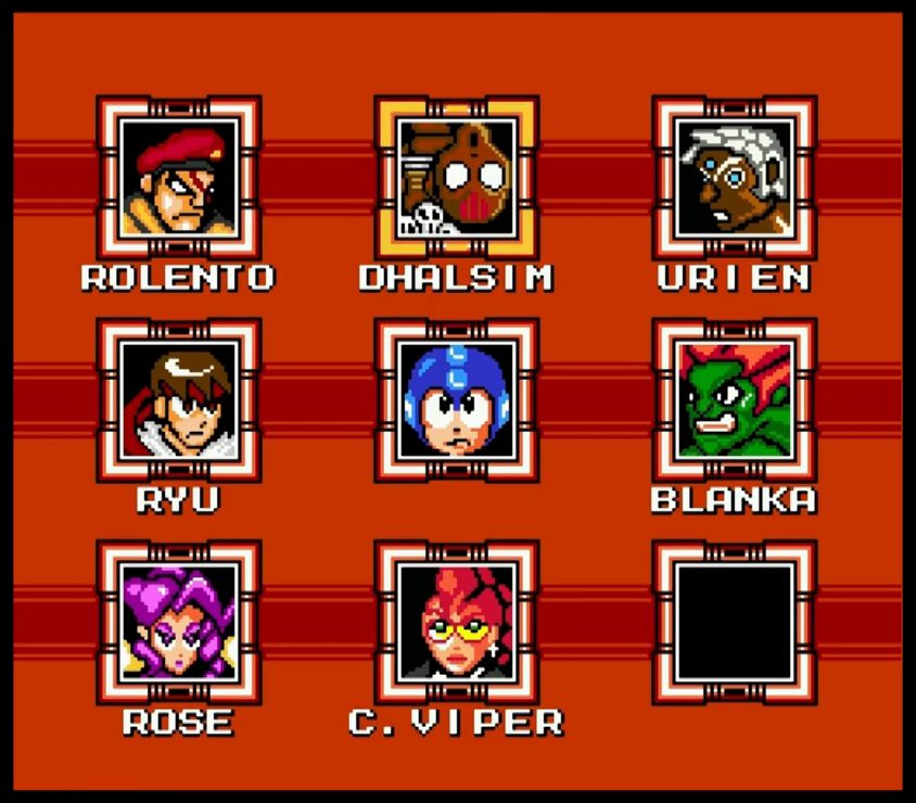 El juego sigue la misma temática clásica en la serie, avanzando un mundo para al final enfrentarte a un jefe de nivel y obtener su arma al derrotarlo. Respecto a los jefes y niveles, podemos decir que han sido muy bien elegidos, ya que están bastante temáticos de acuerdo con el personaje y escenario al que representan. Los ocho robot masters, o este caso peleadores, que enfrentaremos al comienzo son Ryu, Chun Li, Rolento, Rose, Dhalsim, Urien, C. Viper y Blanka. Cada uno de estos niveles no sólo está bien adaptado gráficamente, sino musicalmente, con tonaditas que mezclan melodías de ambas franquicias.