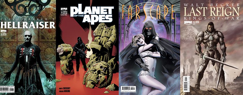 La editorial se comenzó a hacer con licencias de series, películas y juegos de culto, como el juego de rol épico Warhammer, la serie de aventura galáctica con marionetas Farscape, la famosa franquicia fílmica Planet of the Apes, y la de películas de terror de culto Hellraiser, cuyo autor Clive Barker escribe cómics exclusivos para Boom!
