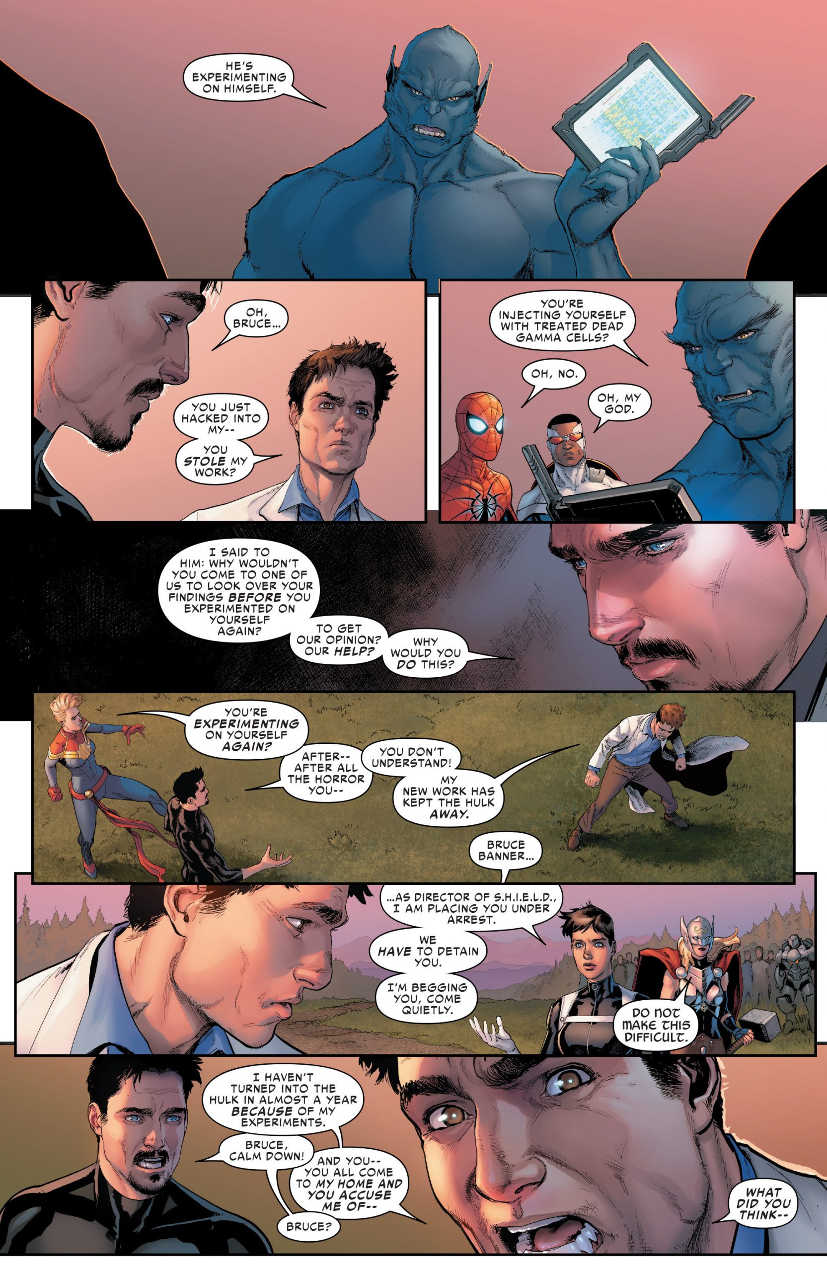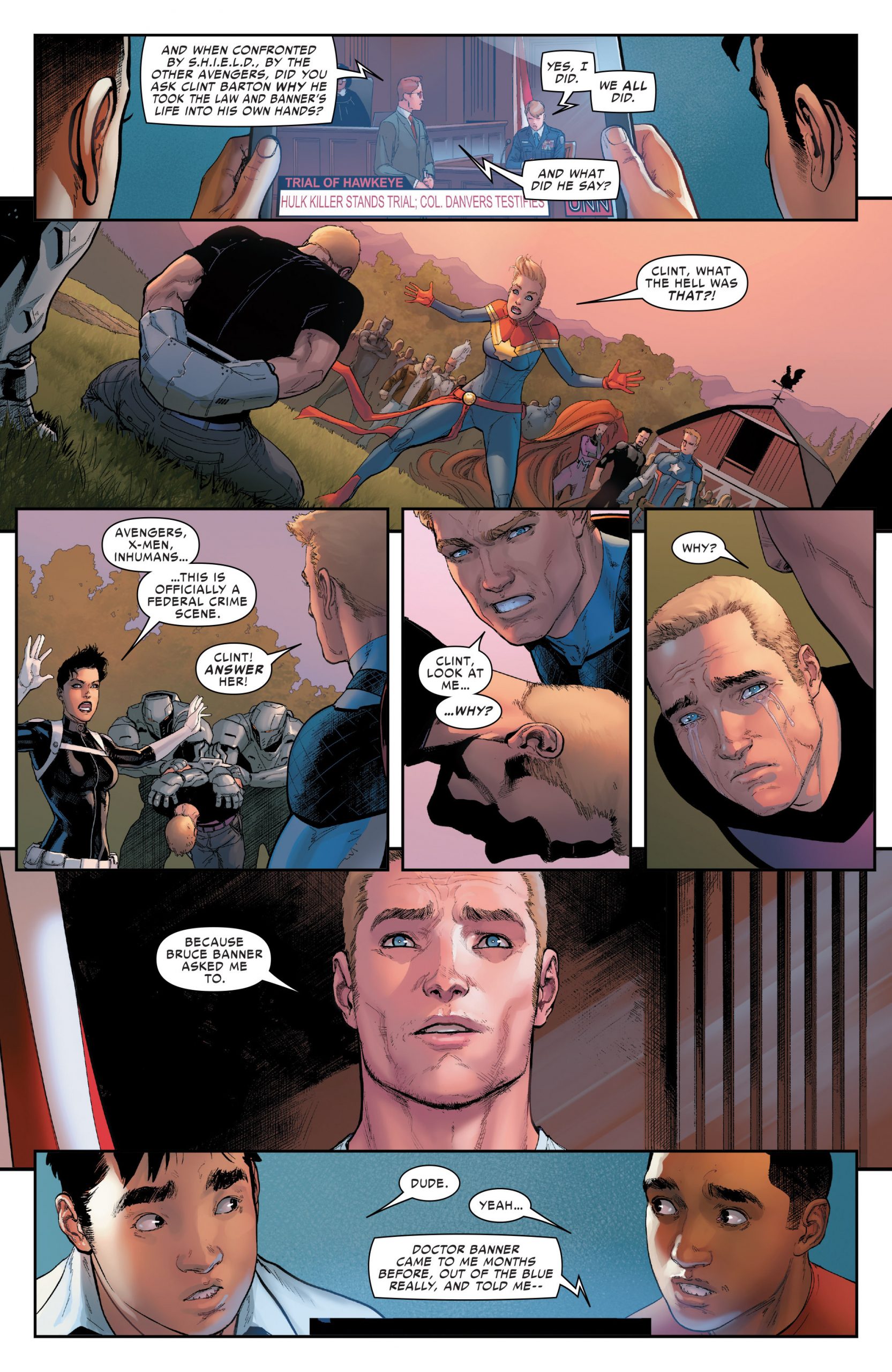 Una flecha atraviesa el pecho del doctor Bruce Banner y lo mata. El culpable: Clint Barton, Hawkeye, quien enfrenta un juicio durante esta historieta, un proceso penal el cual Tony Stark quiere que también enjuicie a Carol Danvers por orillar a Hakewye a disparar la flecha. Sin embargo, de acuerdo con Clint, el mismo Banner le pidió que lo matara en caso de que estuviera a punto de convertirse de nuevo en Hulk (algo que hubiera cumplido la “profecía” al estar reunidos un buen número de superhéroes en ese momento).