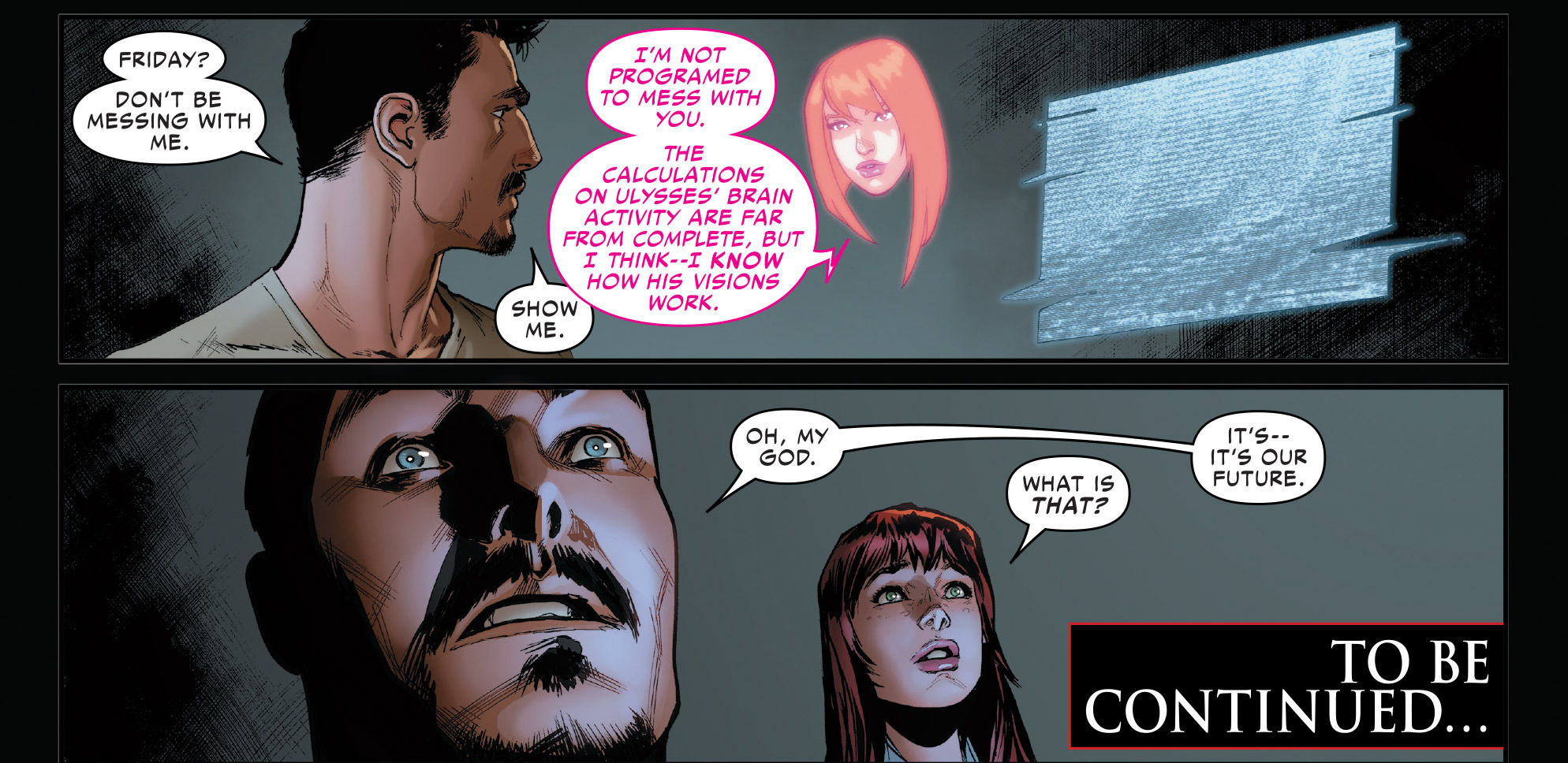 En Civil War II #2 la última visión de Ulysses, el inhumano que puede ver y experimentar el futuro (y hacer que otros también lo hagan), es sobre Hulk aniquilando a todos los superhéroes de la Tierra. Ambos bandos, el liderado por por Tony Stark y el de Carol Danvers, parten en su búsqueda en Civil War II #3.