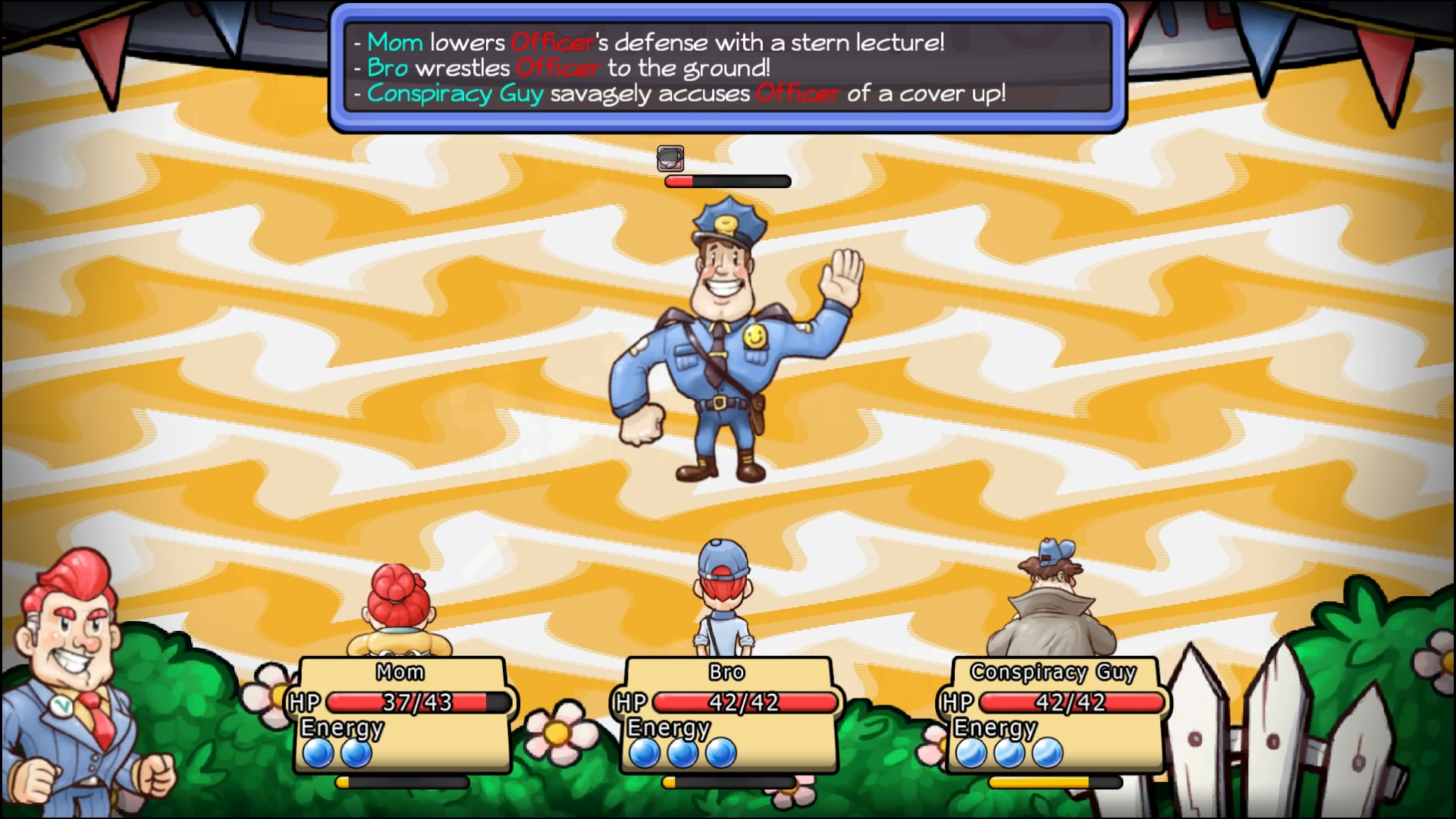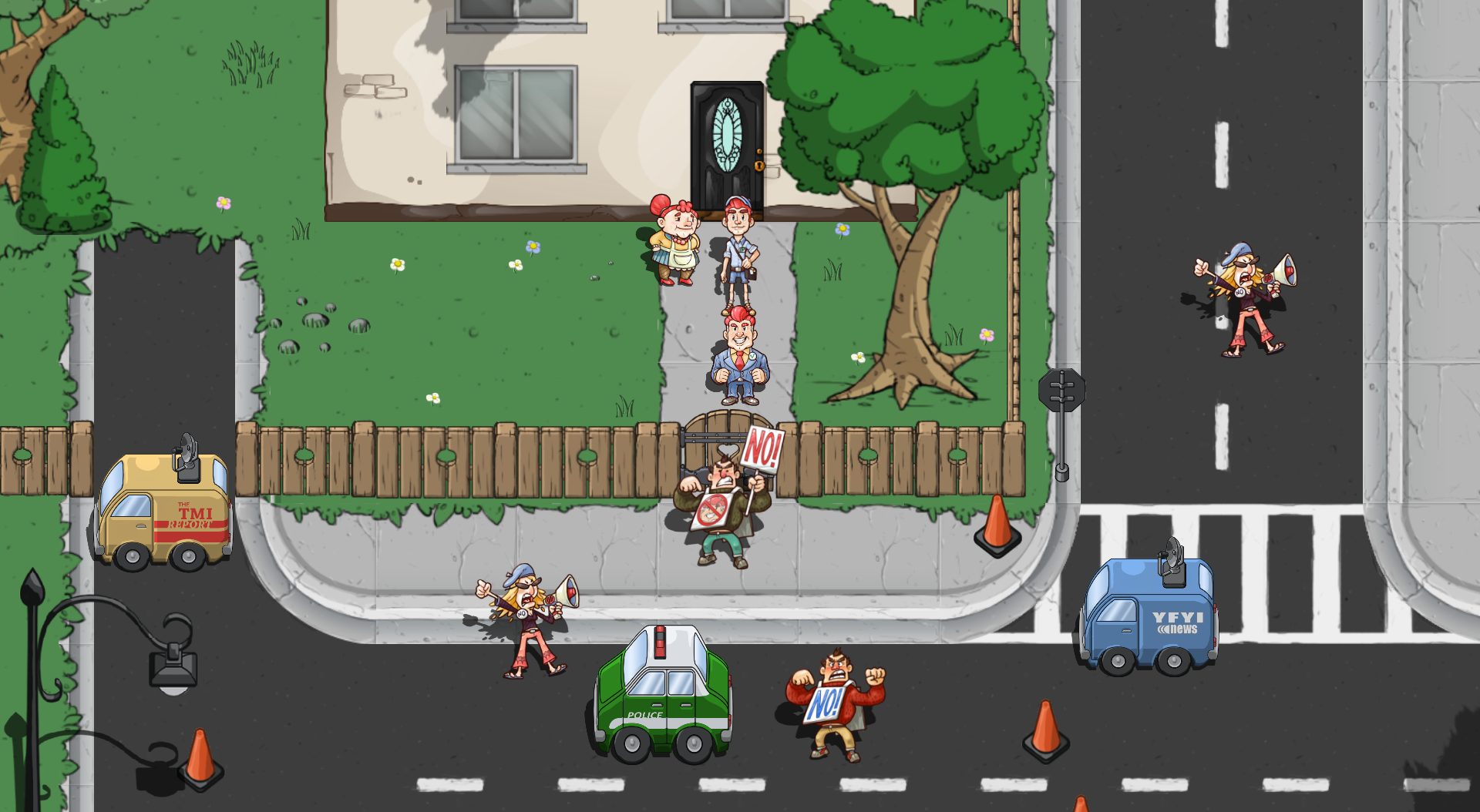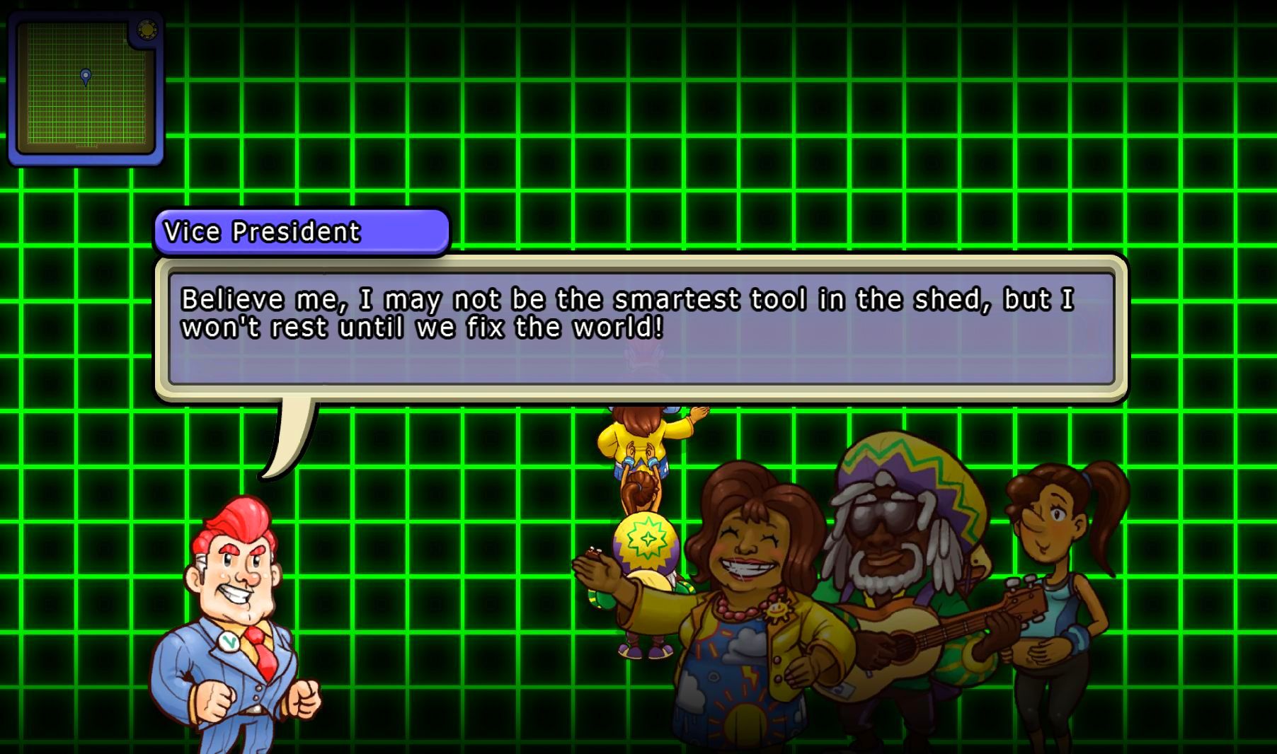 Esto es bien importante, pues como buen vicepresidente que eres pones a pelear a todos por ti, hasta a tu madre –literalmente-. ¿No había comentado que controlabas al vicepresidente? Bueno, así es, eres el segundo al mando en la Tierra y lo primero con lo que te topas es una turba iracunda que pide tu renuncia y un rival político dispuesto a hacerte polvo. Tu madre y tu hermano se unirán a tu causa al principio, ayudándote a lidiar con fieros enemigos como hippies y manifestantes.
