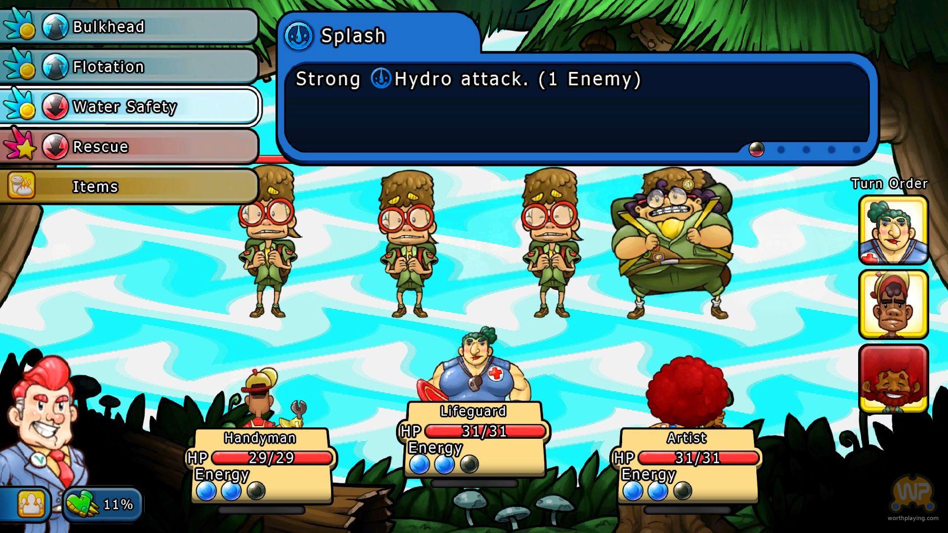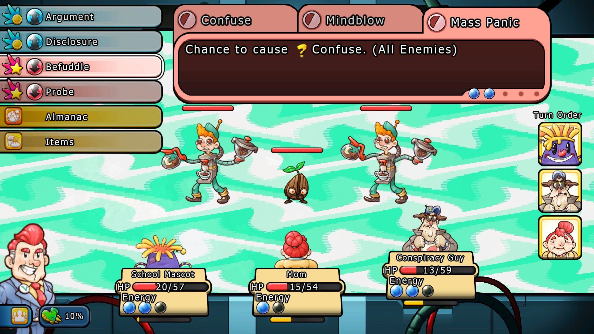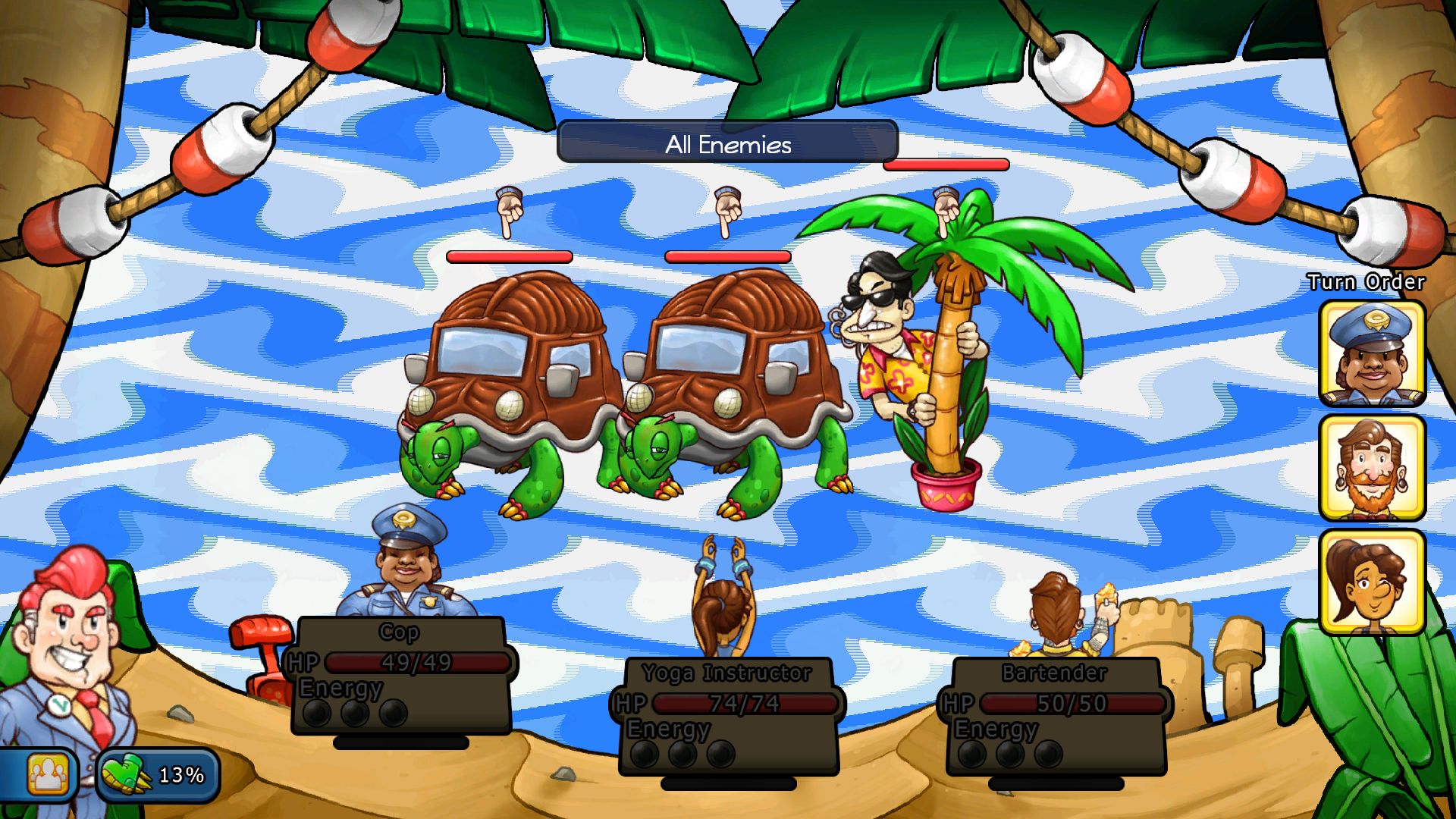 El sistema de pelea de Citizens of Earth es harto sencillo (y uno de los ciudadanos te ayuda a subir o bajar la dificultad si tienes problemas). Es un RPG por turnos, con ataques normales que sirven para cargar los especiales y los especiales que ocupan un par de stocks para ejecutarse. La estrategia es la base de todo, así como traer un equipo equilibrado.