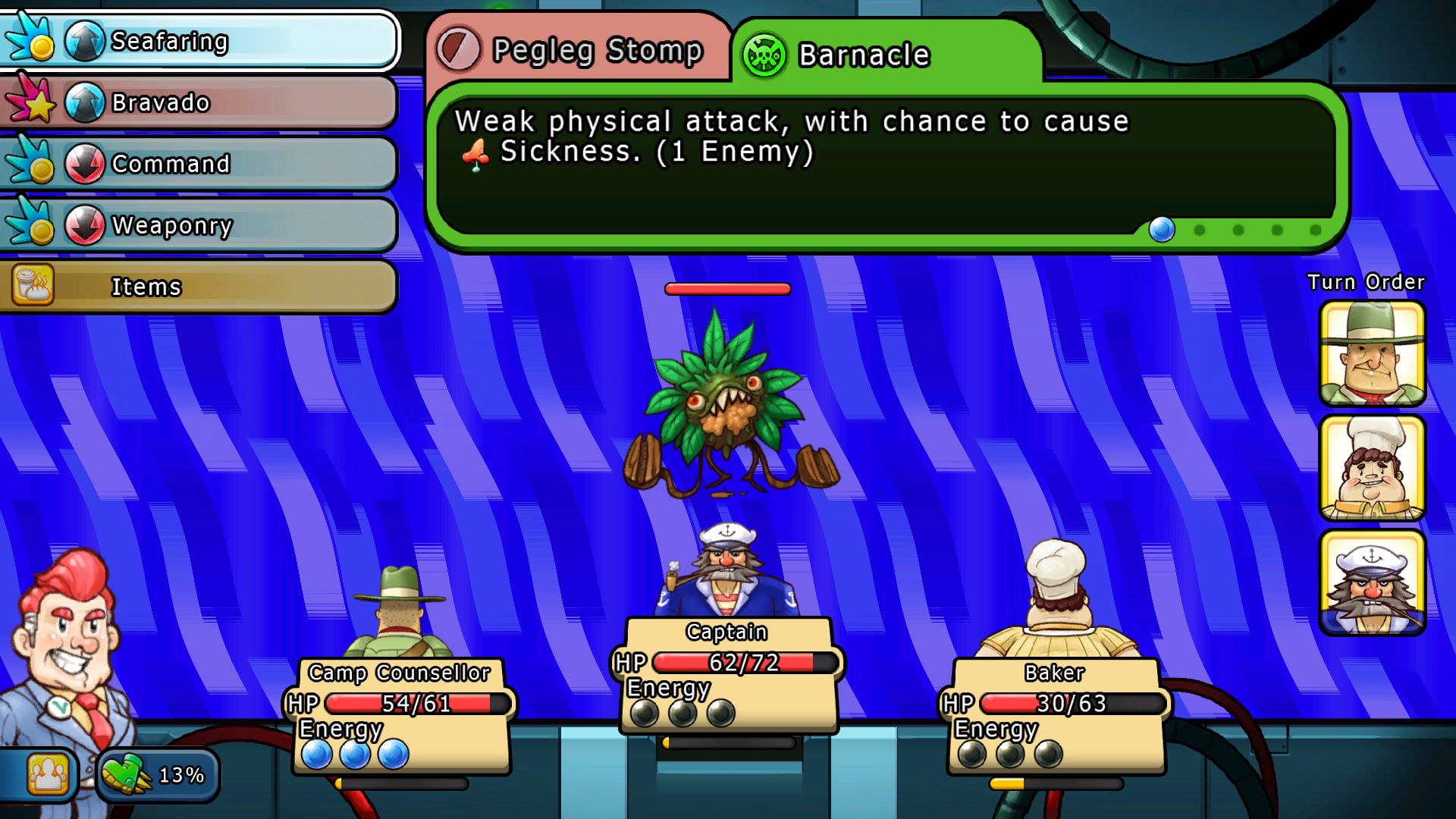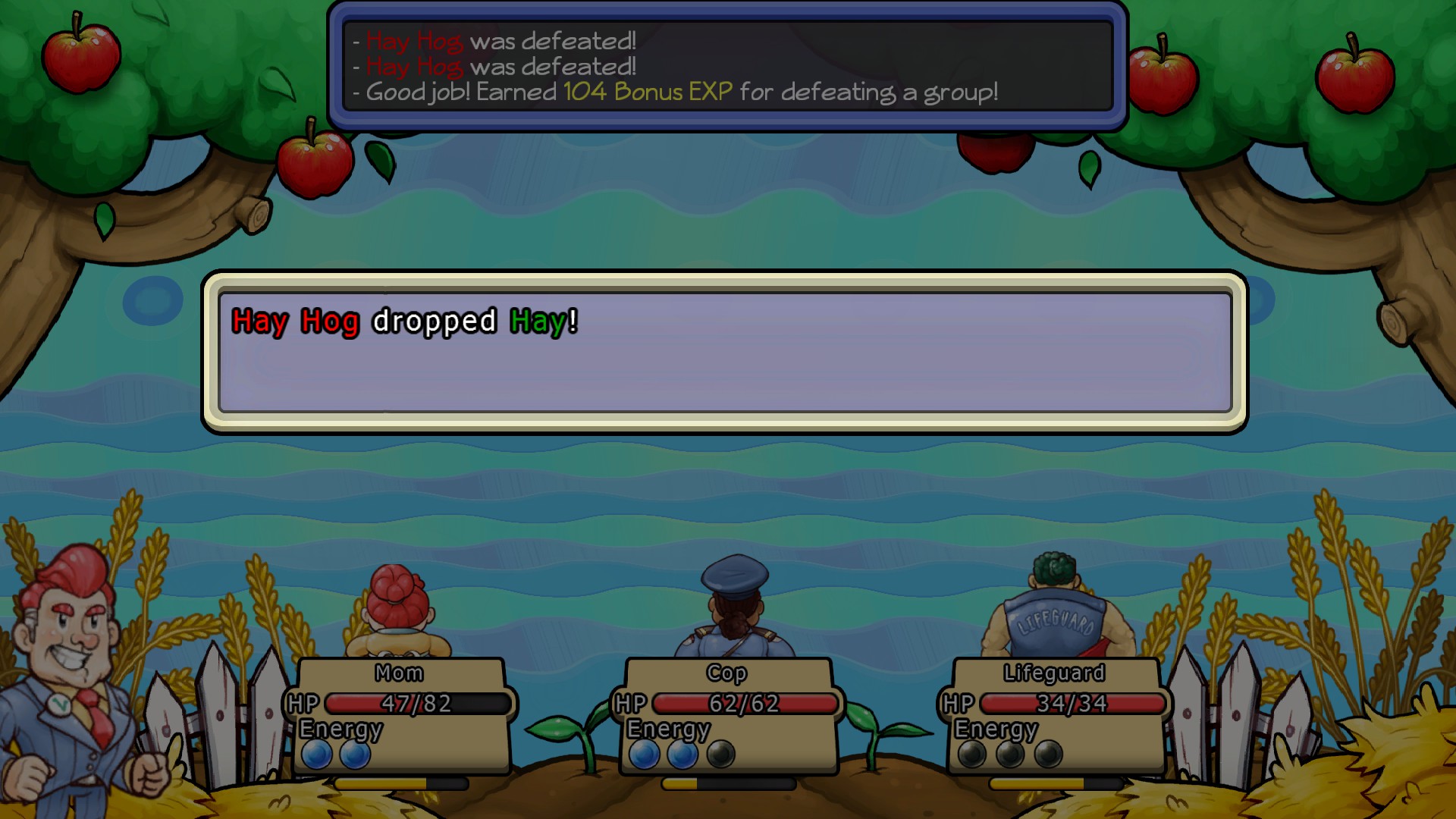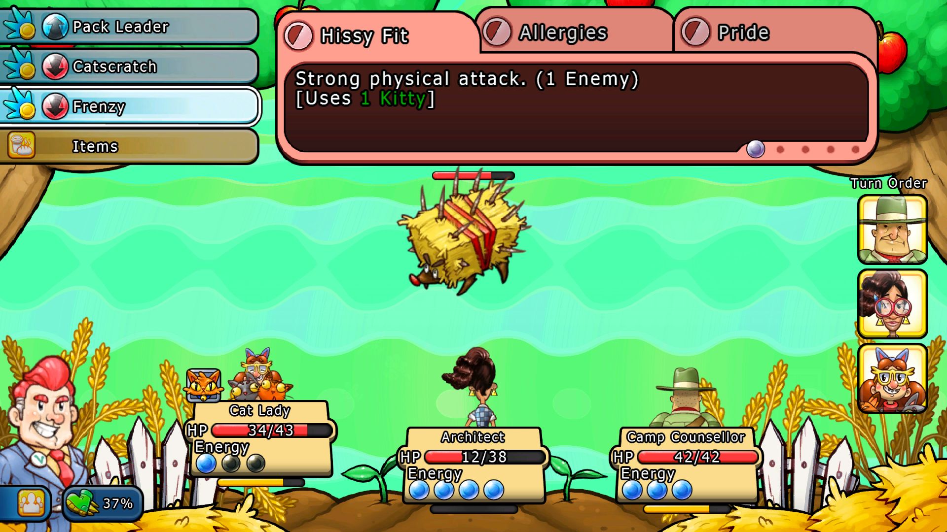 El sistema de pelea de Citizens of Earth es harto sencillo (y uno de los ciudadanos te ayuda a subir o bajar la dificultad si tienes problemas). Es un RPG por turnos, con ataques normales que sirven para cargar los especiales y los especiales que ocupan un par de stocks para ejecutarse. La estrategia es la base de todo, así como traer un equipo equilibrado.