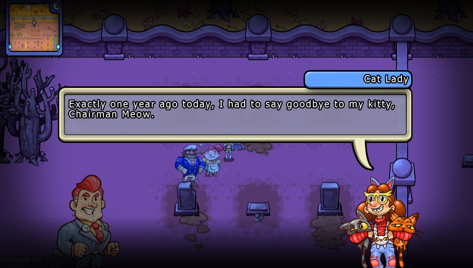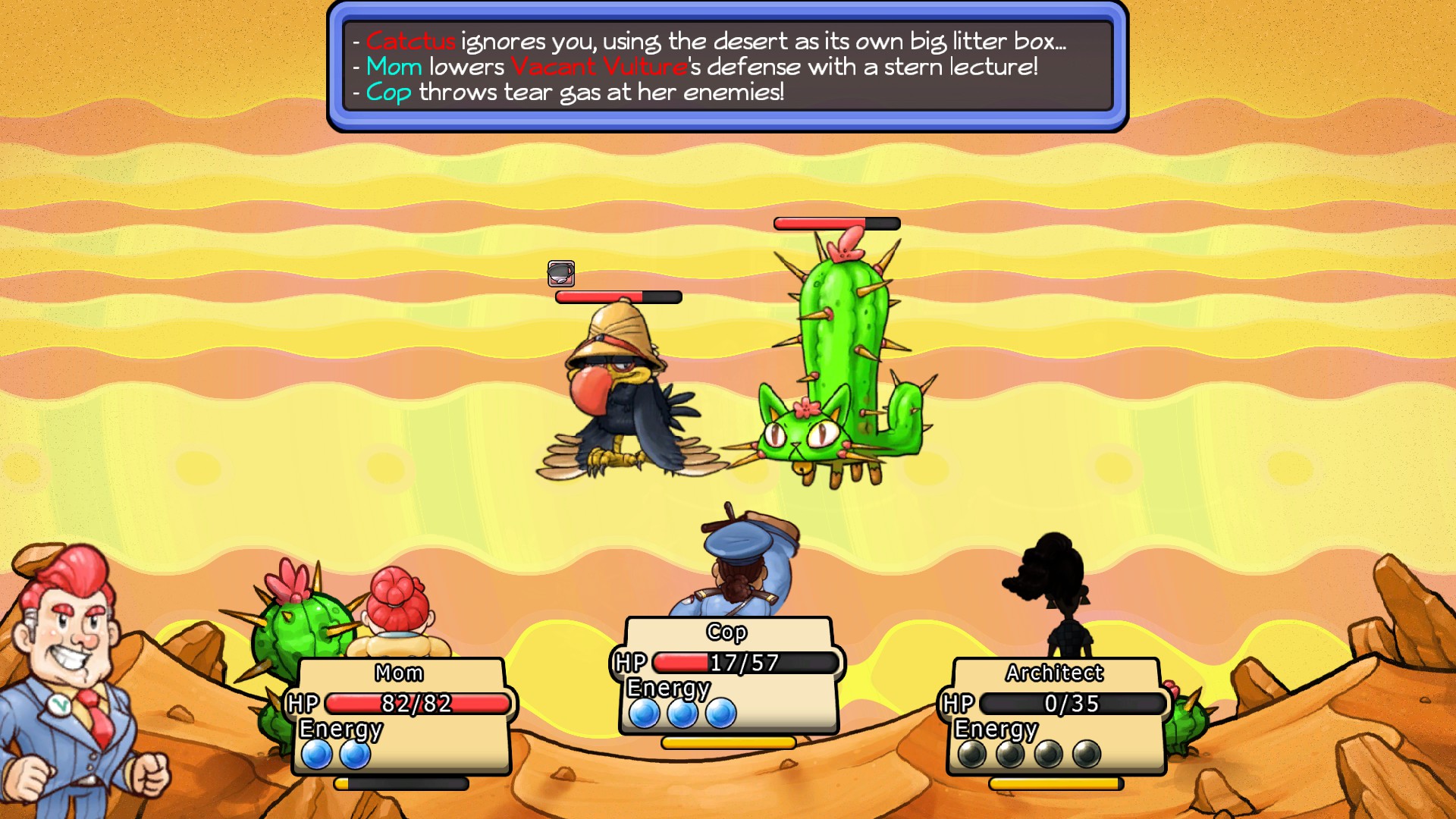Los diálogos entre el vicepresidente y los ciudadanos son de lo más divertidos, lo mismo que las parodias a negocios, la políticas, la farándula y los videojuegos. Todo en Citizens of Earth se lo toman a broma. También a los ciudadanos, y pronto verás que tu equipo está formado por un grupo de personajes bien curiosos, desde una jefa de Policía, pasando por un salvavidas, un bartender, una niña amante de los gatos, una foto reportera y hasta la mascota de la escuela local.