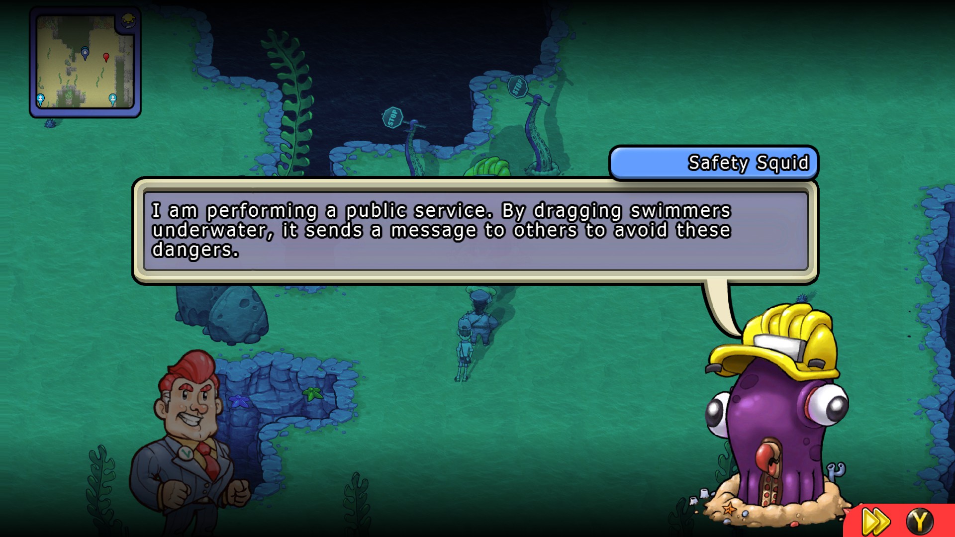 No había abordado la trama porque en verdad es difícil resumirla. La historia de Citizens of Earth se torna más extraña con cada nuevo objetivo, con misiones que rayan en lo absurdo pero que se distinguen en que tú ayudas al presidente y a su vez a los ciudadanos, lo que va dando forma a las pequeñas subtramas. Por ejemplo, el primer misterio en la ciudad tiene que ver con animales salvajes en el bosque y una cafetería que ha perdido el sabor. Al final nos damos cuentas que el negocio era una nave espacial… y bueno, así sucesivamente, loquera tras loquera le van dando forma una entretenida campaña.