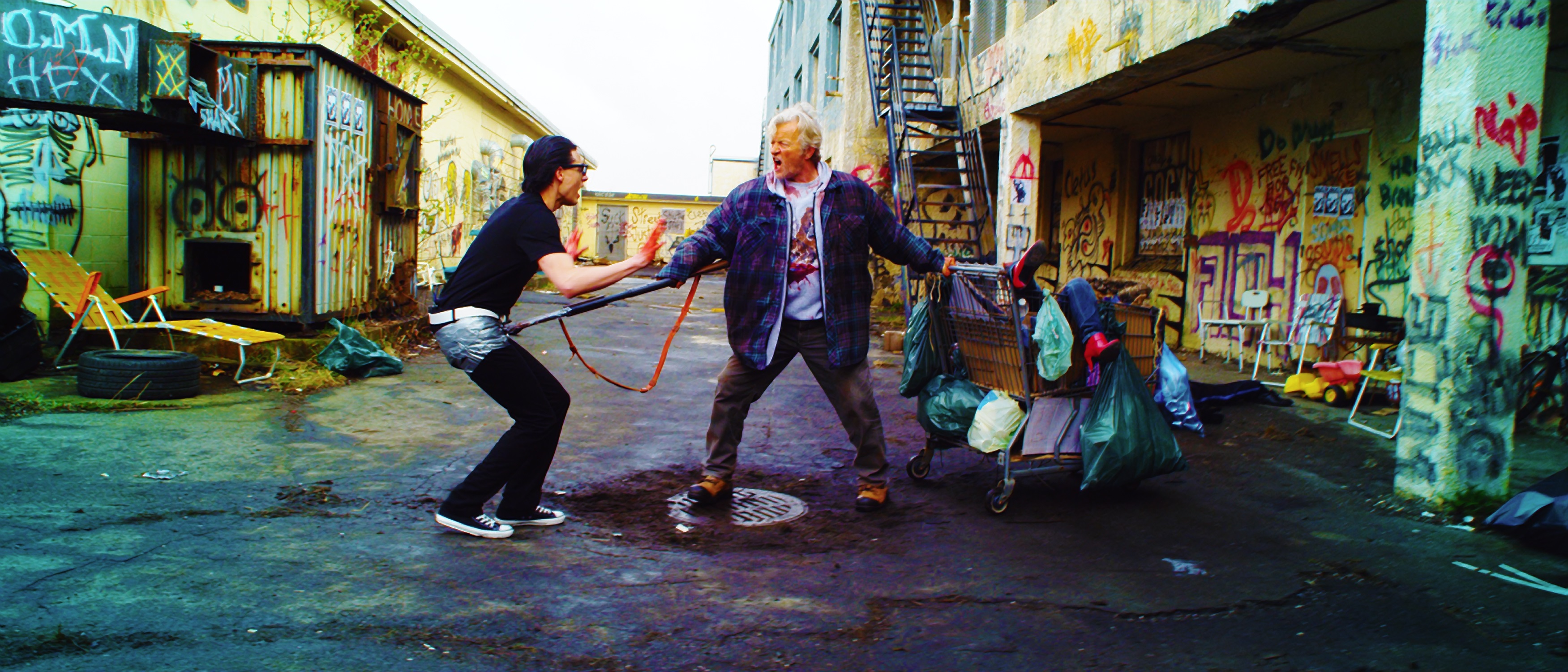 La ley no puede (y en algunos casos no quiere) detener al que pareciera es el dueño de tal lugar, The Drake (Brian Downey), quien gobierna y reparte caos junto a sus dos hijos, Ivan y Slick (este último el más sádico y violento). Claro, todos sabemos que con el transcurso de la historia estos tres personajes se toparán con Hobo y su escopeta.