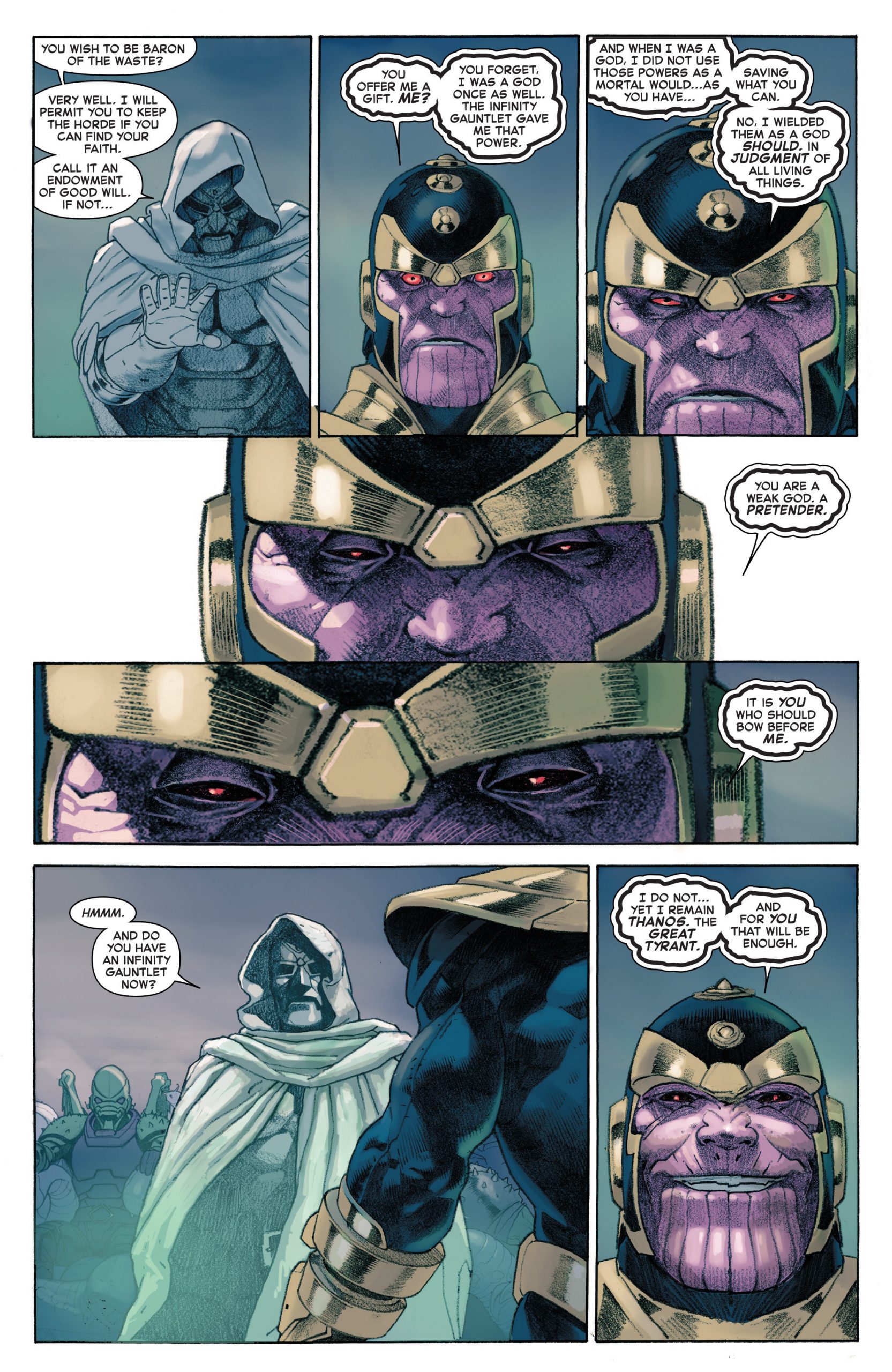 Páginas más tarde, la invasión de Thanos llega a Battleworld; el conquistador universal sugiere a Doom que se arrodille ante él y le da una lección de lo que es ser un dios. Obviamente Victor von Doom no se toma bien ser menospreciado y aleccionado por su rivales, por lo que simplemente lo mata cual fatality de Mortal Kombat. Uno de los mejores momentos de Secret Wars a la fecha.