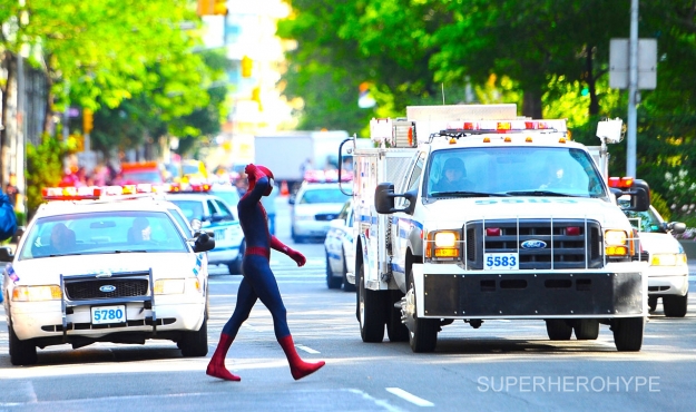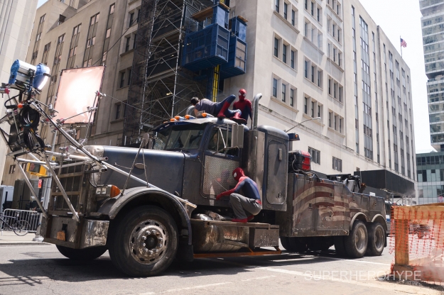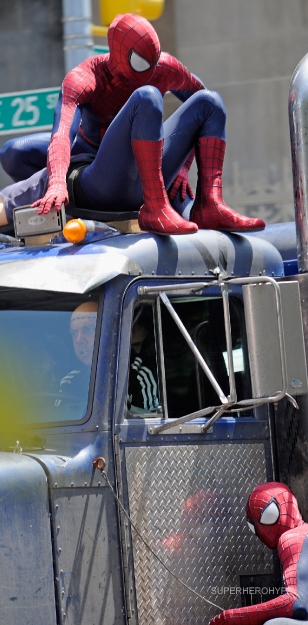 Las nuevas fotografías de fueron tomadas directamente desde el set de grabación en Nueva York de El Sorprendente Hombre Araña 2 donde veremos a Spider-Man realizando algunas acrobacias en un camión de policía, mientras en muchas otras lo vemos junto a sus dos extras.