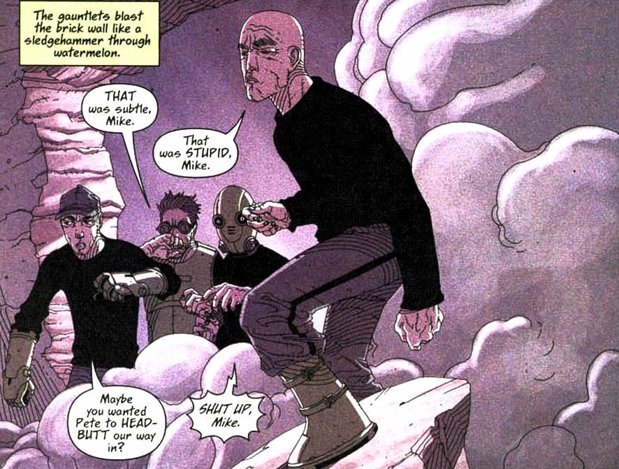 Una adolescencia dura moldeó a Mike en un hijo de la chingada. A él le tocaron los guantes, con los que puede lanzar rayos, freír cosas, disparar y un montón de gracias similares. Lo primero que hace tras asaltar la tienda es irse a vengar de su padrastro, Bob McVee, “tostándole los huevos”. Es un dealer de cosas robadas, trafica autopartes y armas principalmente… y quiere “pedalearle la bicicleta” a Trent asumiendo el rol de padre ejemplar y pareja cariñosa.