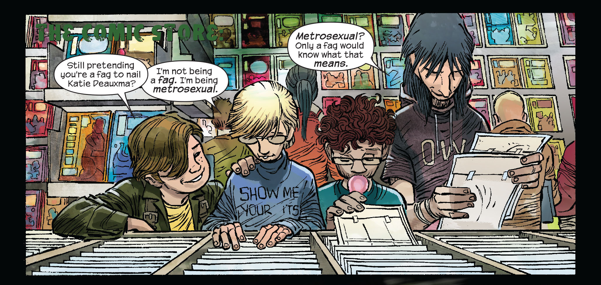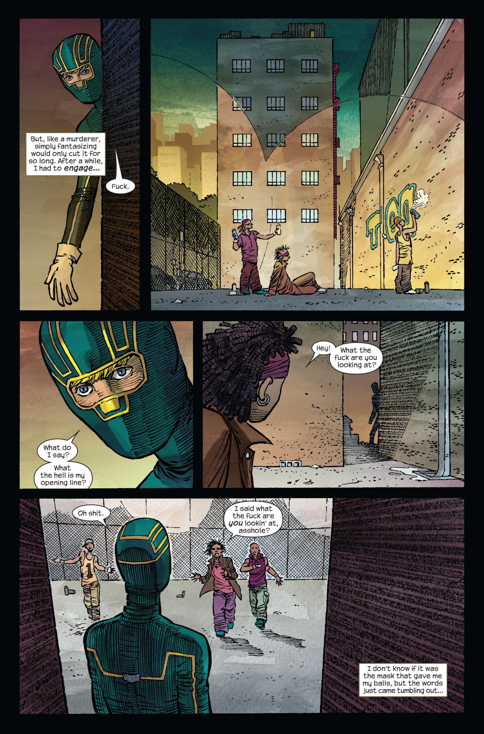Esta primera parte de Kick-Ass da vida a algunas de las mejores páginas que ha escrito Mark Millar. La forma en cómo logra no sólo aterrizar a sus personajes a la realidad, sino introducirlos a la dinámica de la vida moderna con Facebook, teléfonos inteligentes y las modas socio-culturales vuelven este tramo de lectura una auténtica delicia. Vaya, hasta el marcado lenguaje altisonante no está ahí como mero gancho comercial, sino porque todos sabemos que se ha convertido en lo cotidiano.