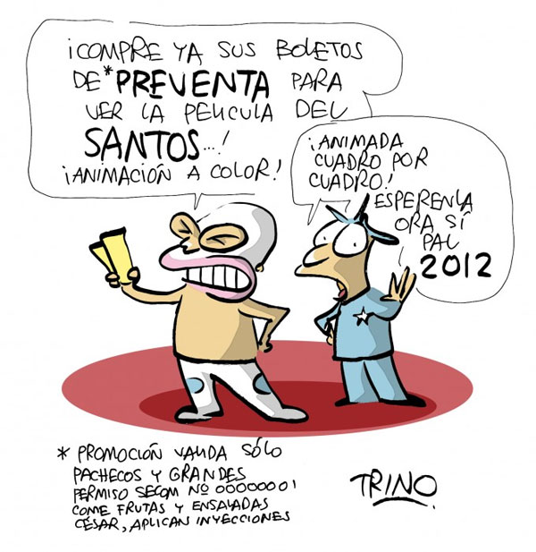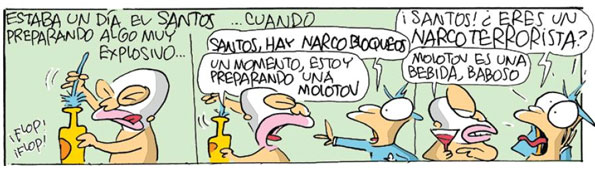 El Santos, acompañado de su fiel amigo El Cabo, siempre se veían envueltos en los enredos más ridículos y fugaces y me regalaron enormes momentos de una risa desenfrenada. Incluso entre las páginas satíricas de la revista en que los conocí, era un descanso de toda la sicosis que desataba cada nota puesta en el sartén de la decadente política nacional.