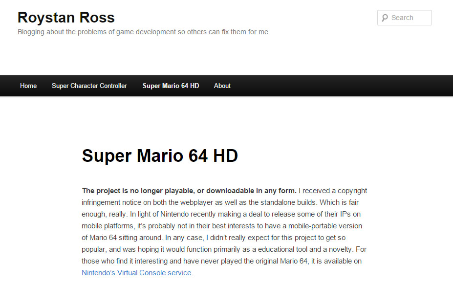 El joven incluso invita a los usuarios a jugar el original Super Mario 64 en la Consola Virtual, mientras que al final de su comunicado cita todas las herramientas, creadas por otros y las suyas propias, que le sirvieron para darle vida a este nivel. Ross no se defendió diciendo que no lucraba o que si era gratis, lo cual parece más bien una añadidura del autor intentando contestar por anticipado a quienes argumentaran eso. Ahora, legalmente el problema no era tanto “usar sin permiso”, sino la distribución del proyecto y la ingeniería de reversa hasta cierto grado.