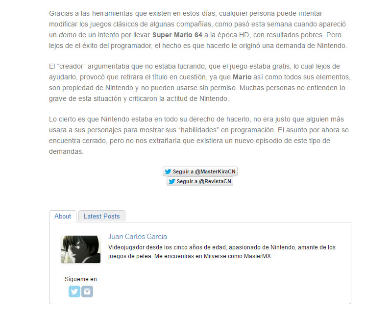 Finalmente, el artículo remata: “Lo cierto es que Nintendo estaba en todo su derecho de hacerlo, no era justo que alguien más usara a sus personajes para mostrar sus ‘habilidades’ en programación. El asunto por ahora se encuentra cerrado, pero no nos extrañaría que existiera un nuevo episodio de este tipo de demandas”. – Es cierto. Nintendo estaba en todo su derecho de reclamar, pero eso no vuelve automáticamente injusto que alguien use sus personajes para mostrar sus habilidades.