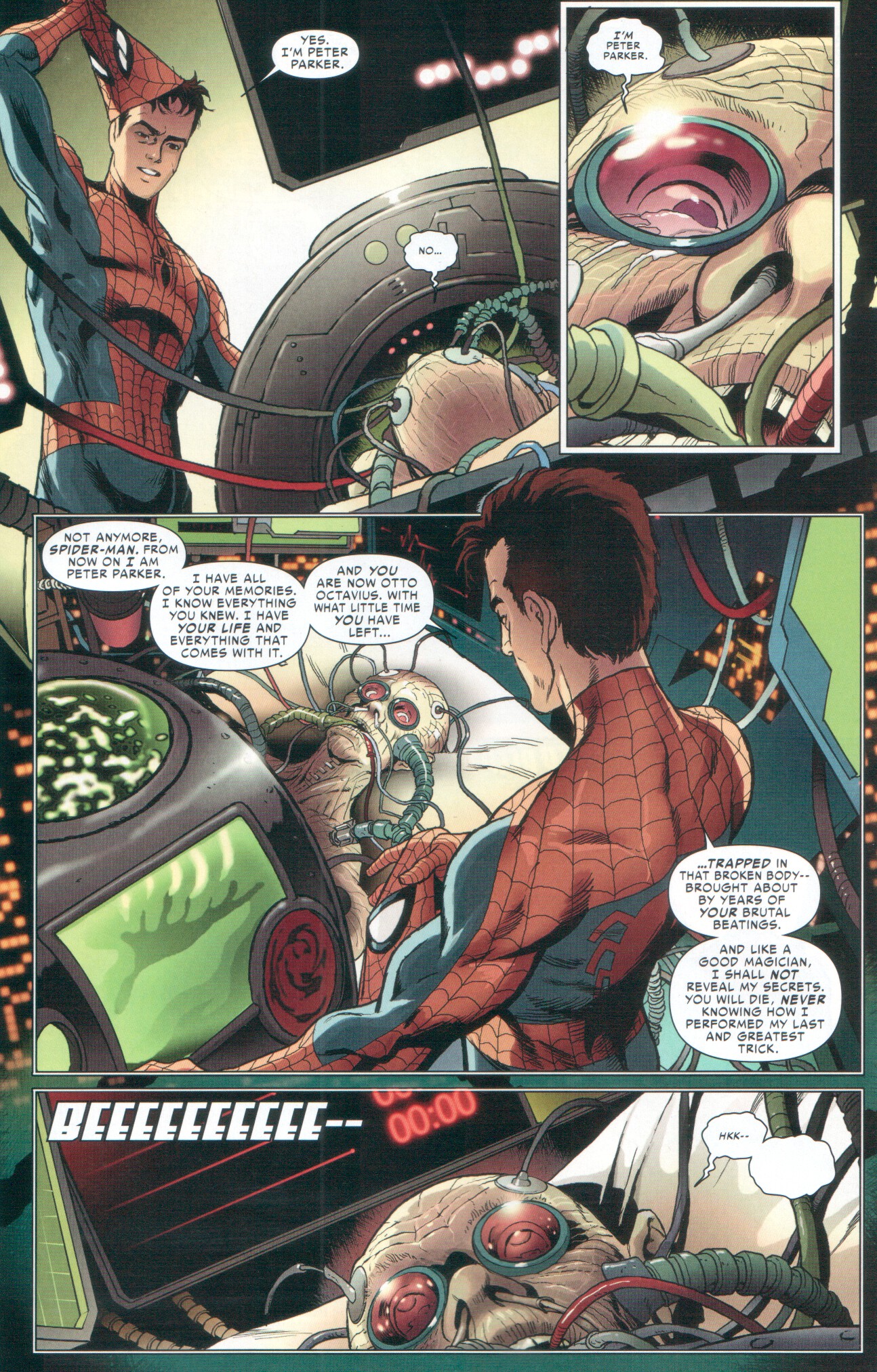 En la sección en cuestión, se muestra un encuentro entre Spider-Man y el agonizante Dr. Octopus (quien en años recientes había sufrido de cáncer debido a todos los Rayos X que ha tenido que tomarse resultado de las fracturas en sus luchas con Spider-Man), el Hombre Araña se quita la máscara sólo para que el Dr. Octopus le revele que él es el verdadero Peter Parker.