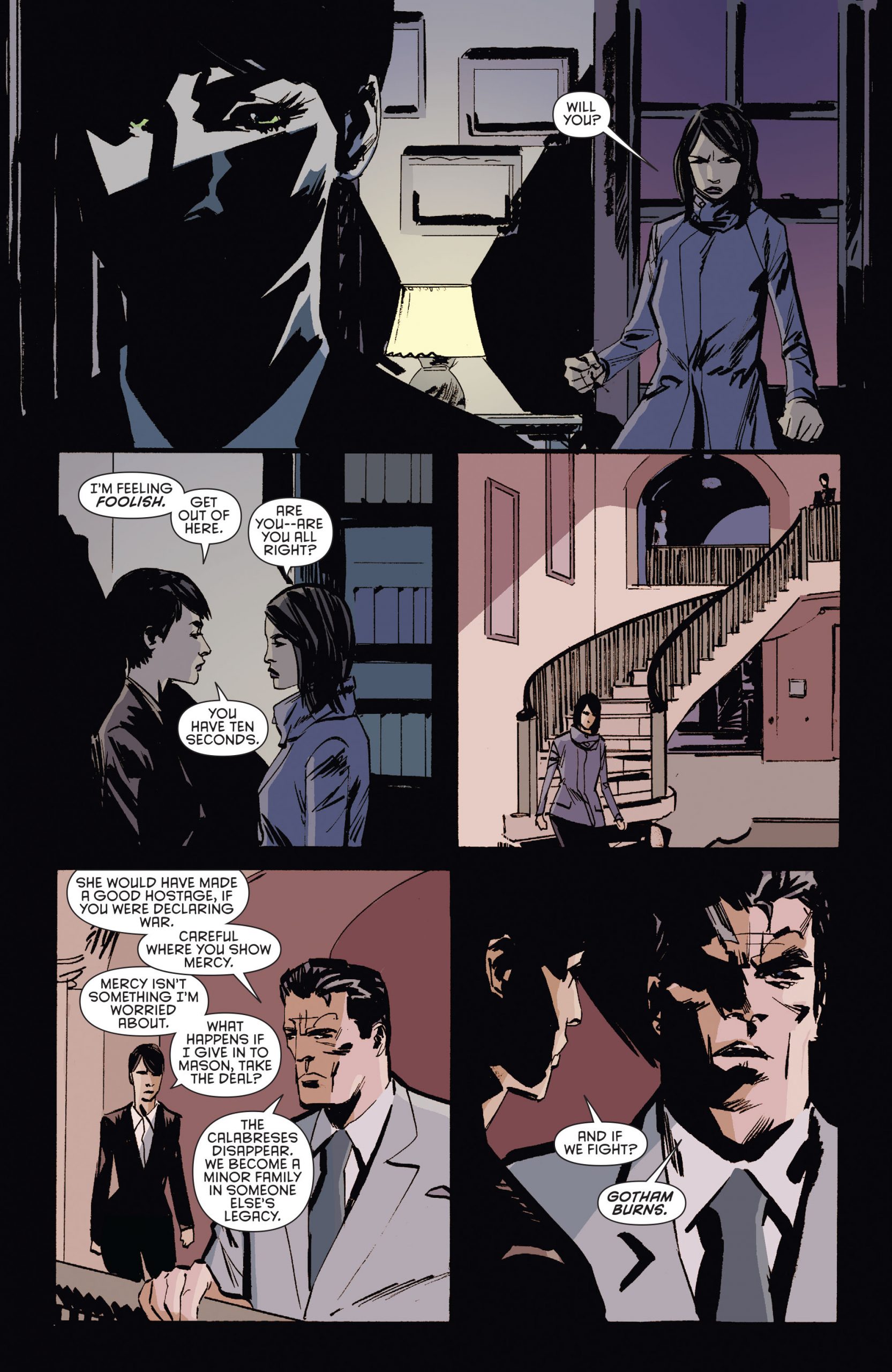 La revelación de la bisexualidad de Selina Kyle llega en un momento en el que actualmente se encuentra retirada como Catwoman, para en su lugar tomar el mando de una de las familias criminales más poderosas de Gotham. Selina confronta a Eiko Hasigawa, la hija de una de las familias rivales. Eiko es la misma chica que ha tomado el traje de Gatúbela para ayudar a Selina. Cuando se encuentran de nuevo la escena termina en un beso.