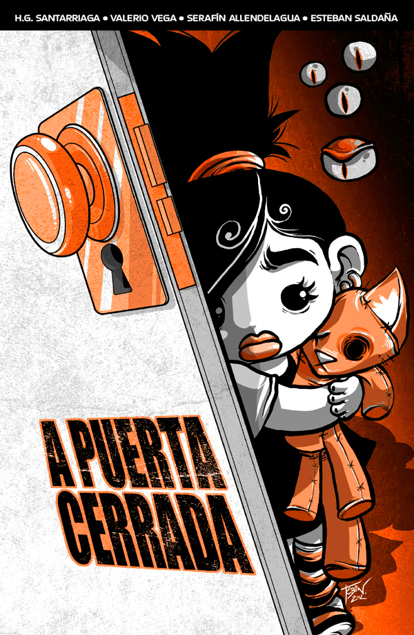 A diez años de su aparición en forma de web cómic (enviado por e-mail), H.G. Santarriaga, Valerio Vega, Serafín Allendelagua y Esteban Tebin Saldaña presentan por primera vez impreso, el mítico A Puerta Cerrada.