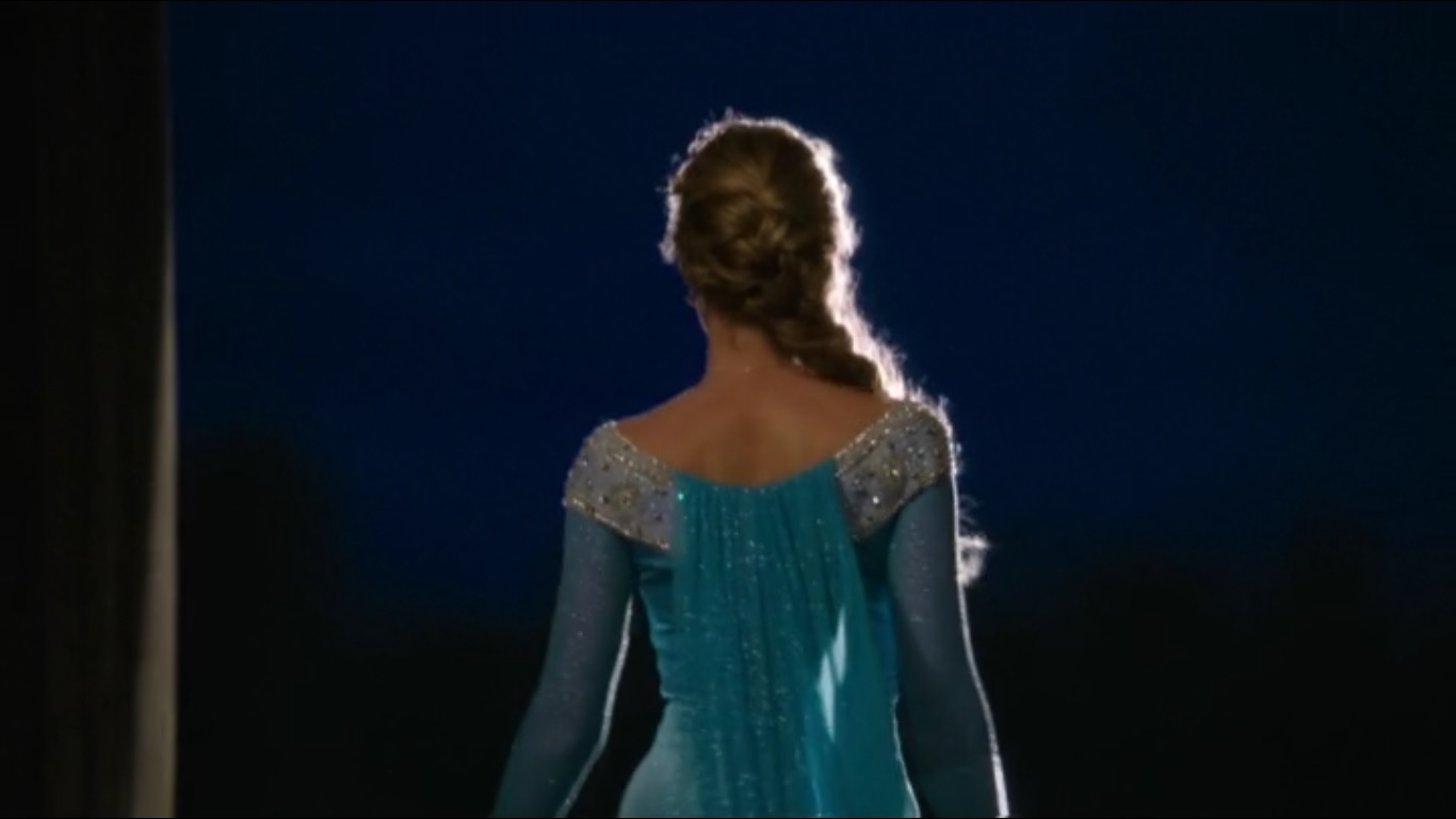 La aparición se realiza, luego de que un recipiente libera agua que finalmente logra materializarse y en un callejón solitario, se materializa Elsa, que aparece de espalda con su vestido azul, larga cabellera rubia y su capa. En la escena se quita uno de sus guantes para realizar un pequeño hechizo y comienza a caminar por la calle dejando su rastro de hielo.