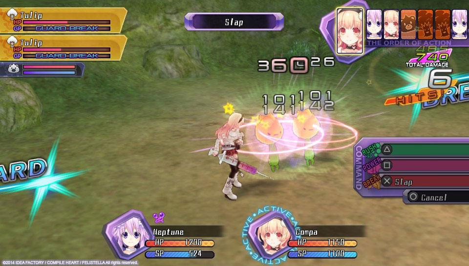 Esto puede ser también un error en el diseño del juego, pues las primeras horas de Hyperdimension Neptunia Victory son bastante permisivas y sientes que tu equipo es invencible, para de repente darte de topes con la pared por un repentino y manchado incremento en la dificultad. Las batallas no sólo te requerirán nivel, sino estrategia para salir avante, ya sea mejorando a tu equipo o debilitando al enemigo previo a atacarlo.
