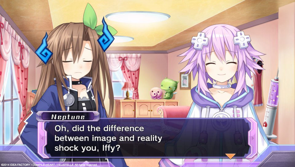 Todos los personajes son unidimensionales, Neptune (la protagonista) sólo se interesa en jugar videojuegos, dormir y de vez en cuando comer. El resto tiene una motivación intrascendente durante el transcurso de la trama. La mecánica de observar sus insulsas problemáticas cambia de vez en cuando para matar a cierta cantidad de monstruos, explorar la zona o realizar algunas encomiendas adicionales.