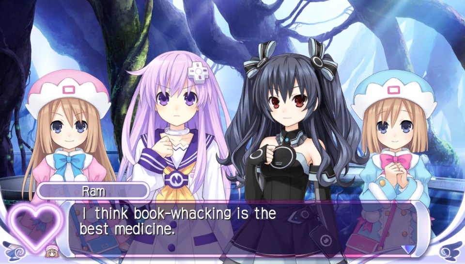 Estoy consciente que este es un problema más con el género y el público meta al que va destinado que con los escritores en sí, pero sospecho que los mangakas (hay manga de Hyperdimension Neptunia) son los mismos que escribieron todos los diálogos para el juego sin entender que es un medio distinto: interactivo. A menos de que seas un clavadazo de este tipo de títulos, existirá una gran desconexión entre el interés del gamer con lo que sucede en pantalla.
