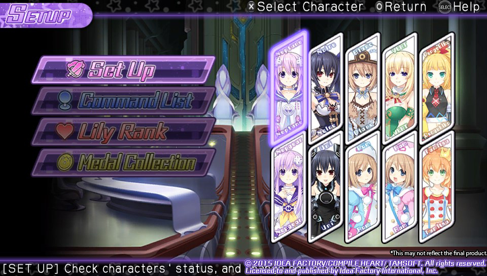 Las pantallas muestran más que nada los sistemas detrás de la acción del juego, como Lily Rank, que incrementa al hacer que ciertos personajes peleen juntos, lo que da bonos como reducir el tiempo de recuperación y más experiencia por combate en Hyperdimension Neptunia U: Action Unleashed.