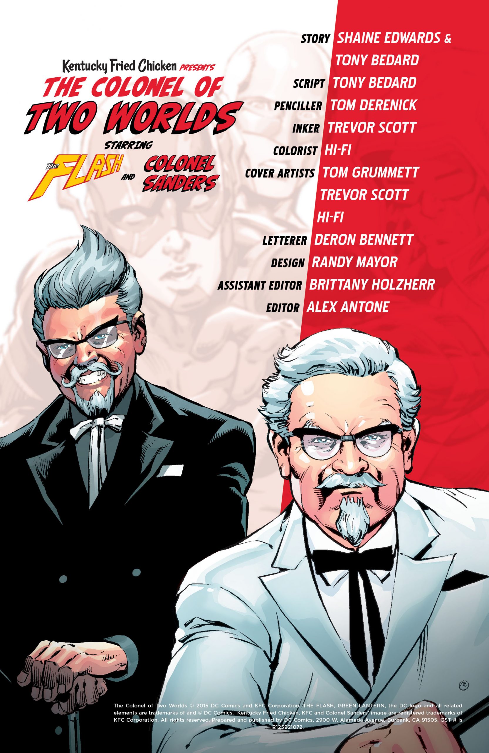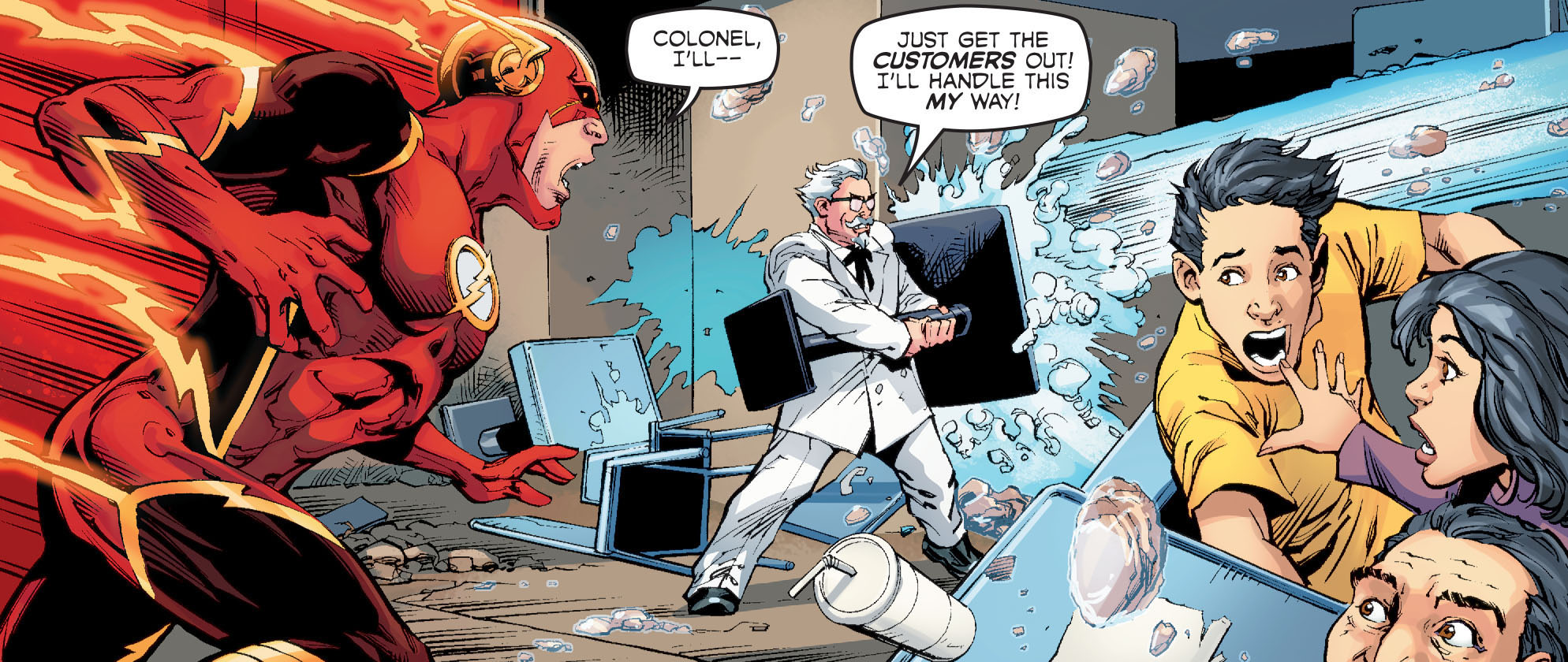 La editorial DC ha sido protagonista de varios de los crossover más extraños en los cómics. A la lista de Asterix, el Conejo de Quick, Muhammad Ali y los Looney Tunes se suma KFC: The Colonel of Two Worlds, un encuentro entre Flash y Linterna Verde con el Coronel Sanders de KFC, la cadena de comida rápida con pollo preparado según la receta secreta de once especias (no es comercial).