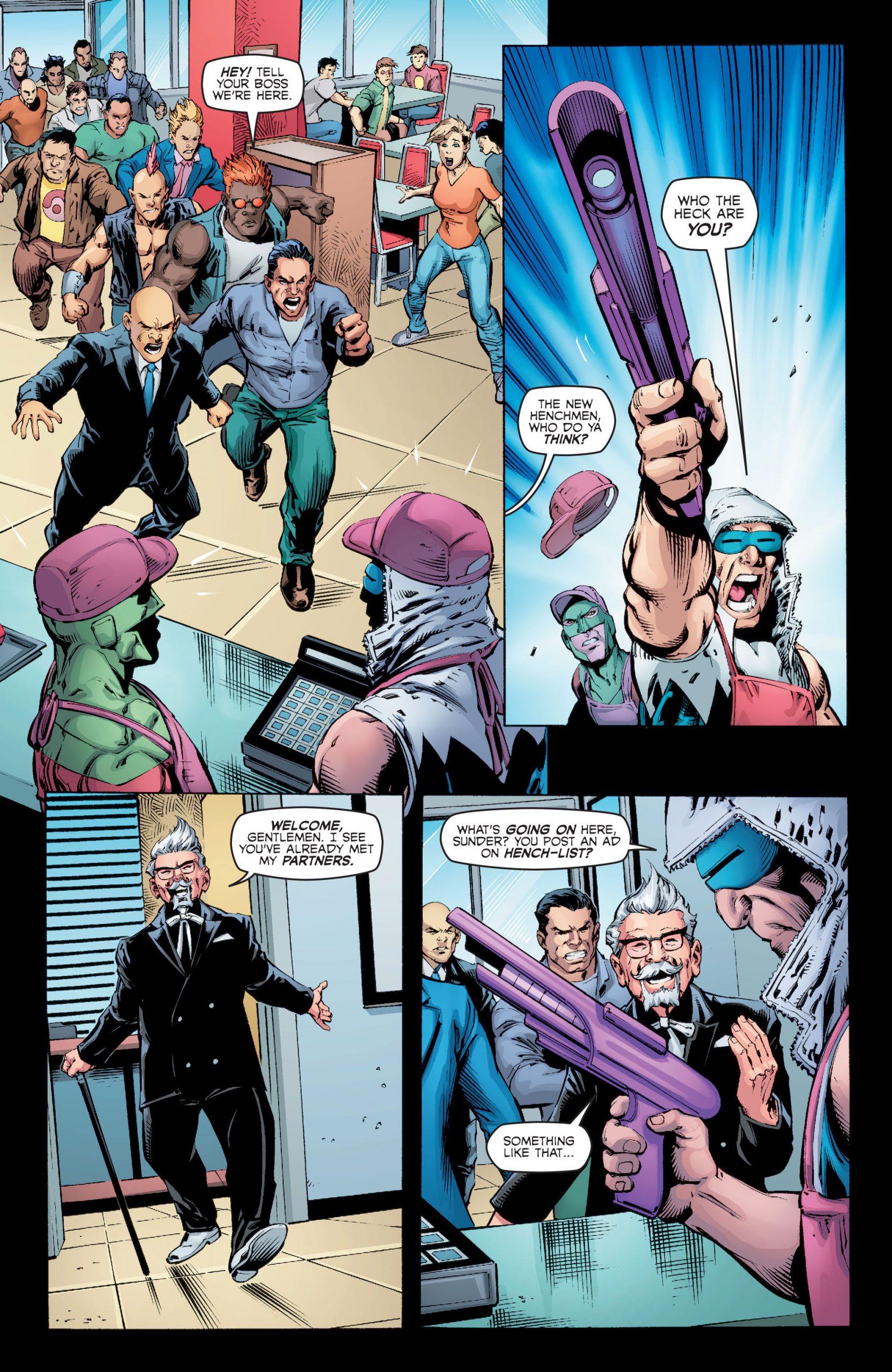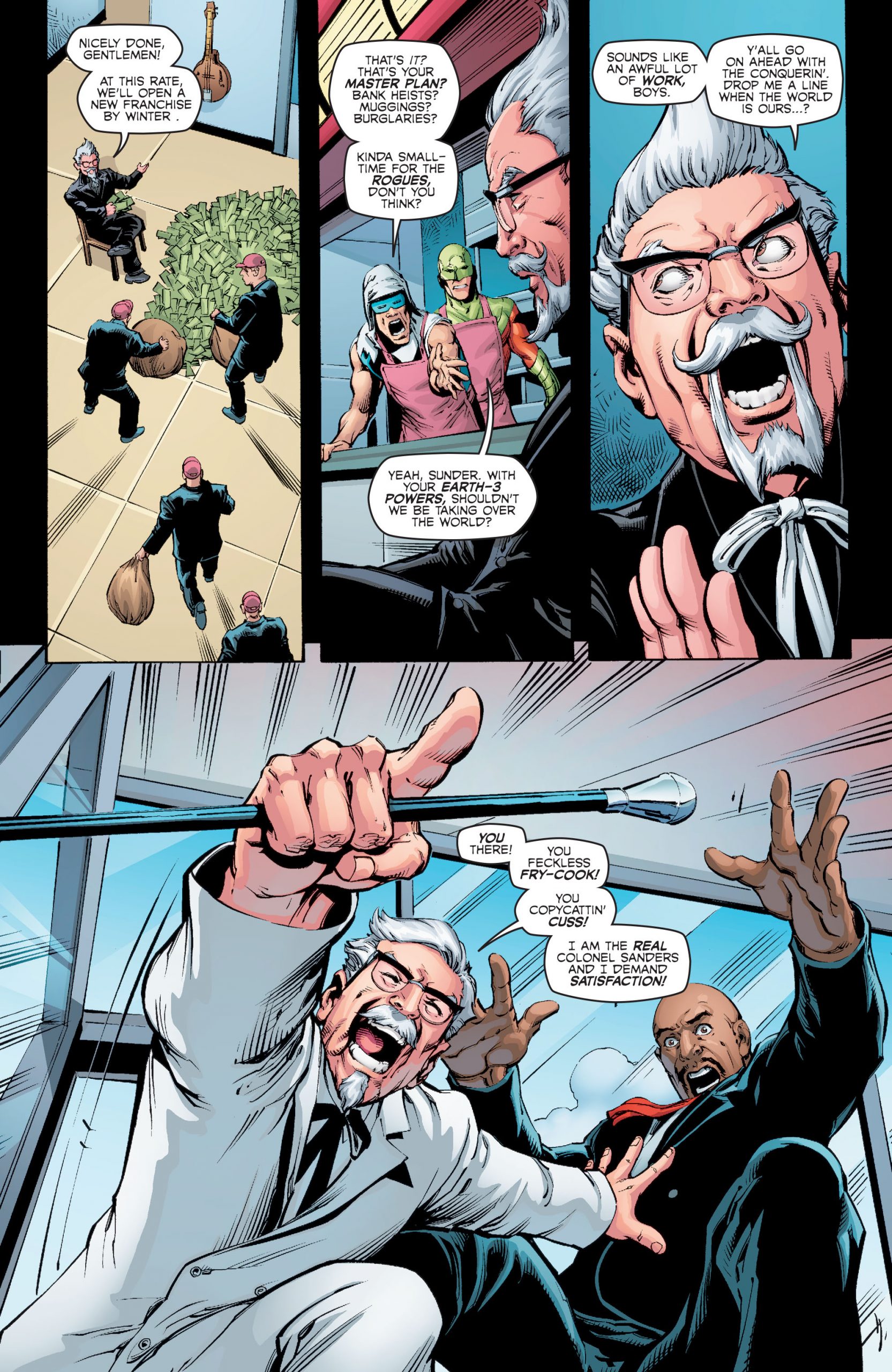 Extraño y todo, KFC: The Colonel of Two Worlds mantiene cierta secuencia con el canon de DC Comics; la historia toma de base los sucesos de Forever Evil, donde una versión maligna de Liga de la Justicia de Tierra-3 invade Tierra-0, y ubica a Captain Cold y Mirror Master invocando a otro villano de Tierra-3 para ayudarles en sus planes de conquista mundial y grandes atracos: el Coronel Sunder.