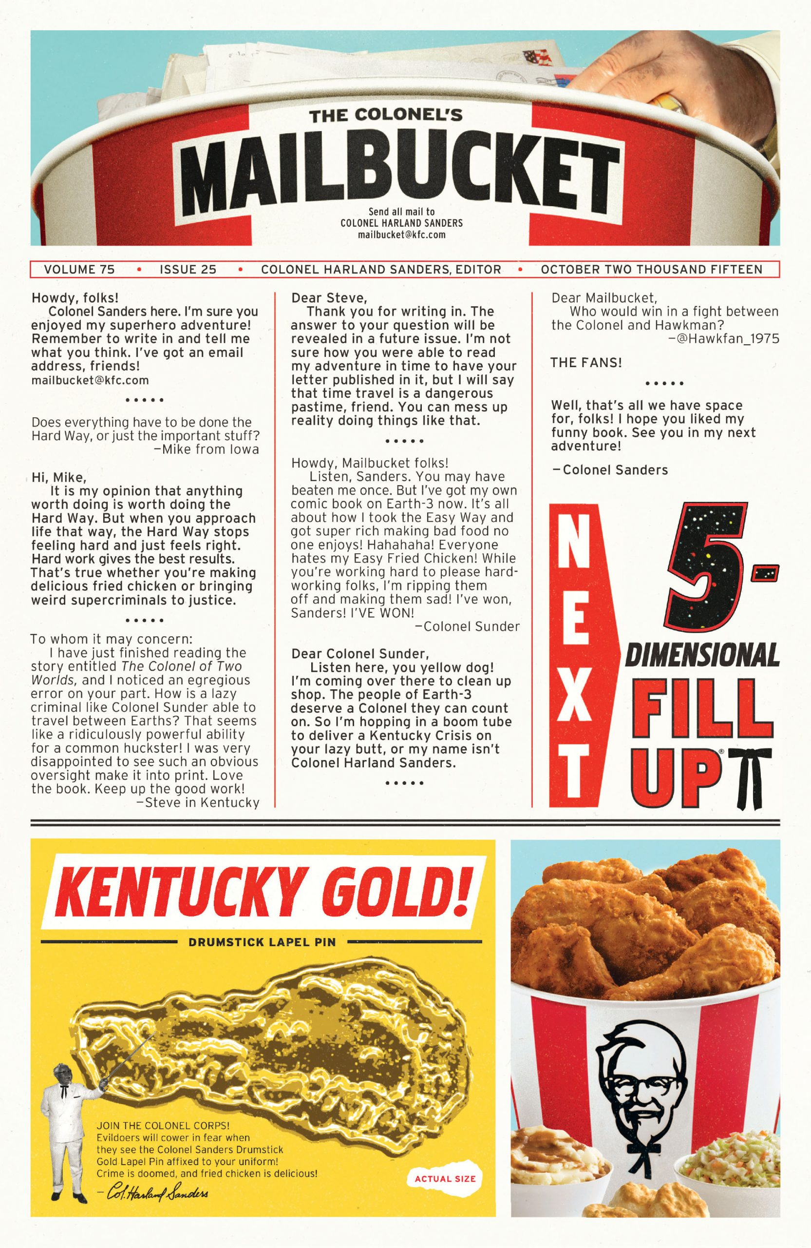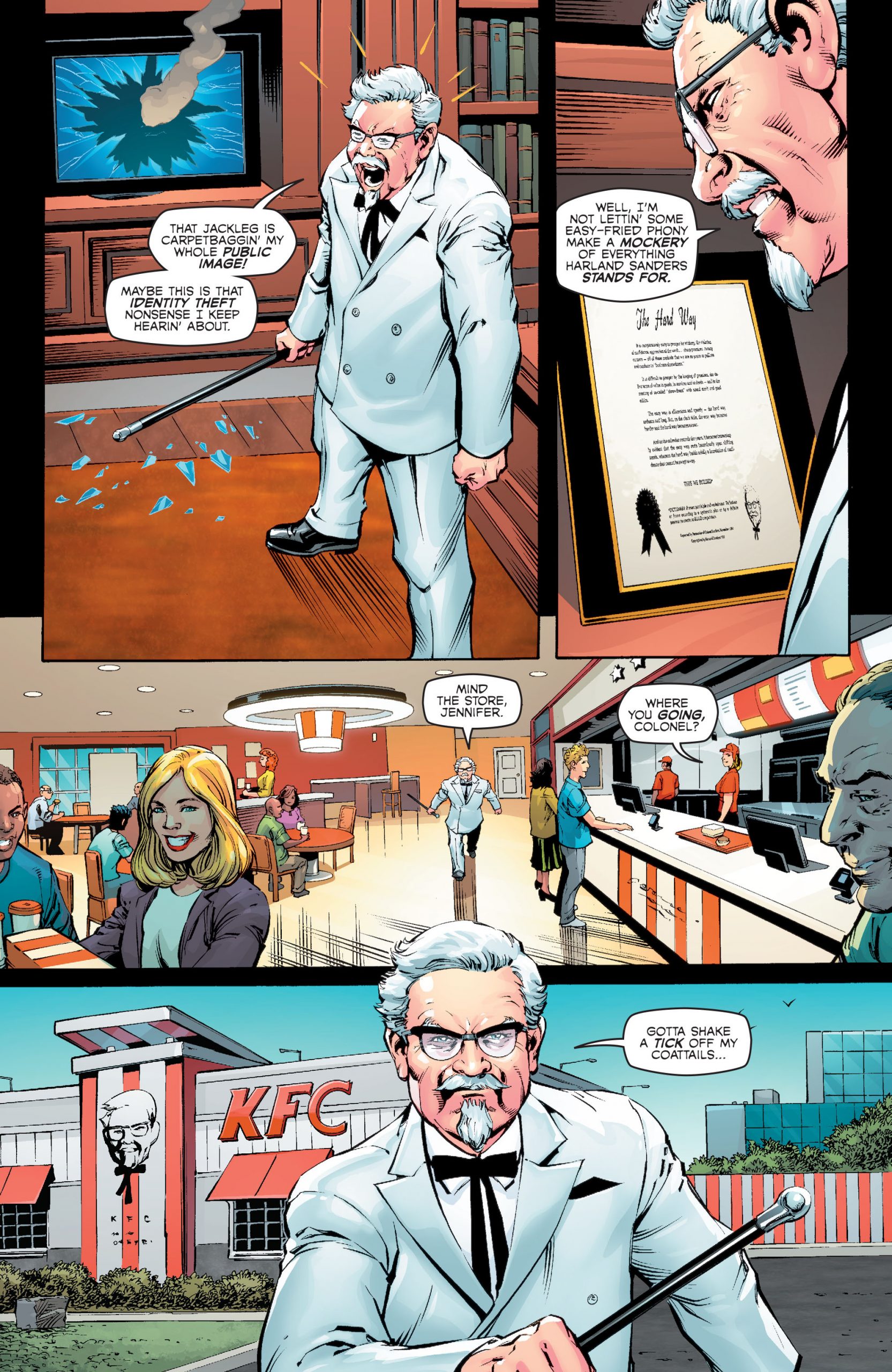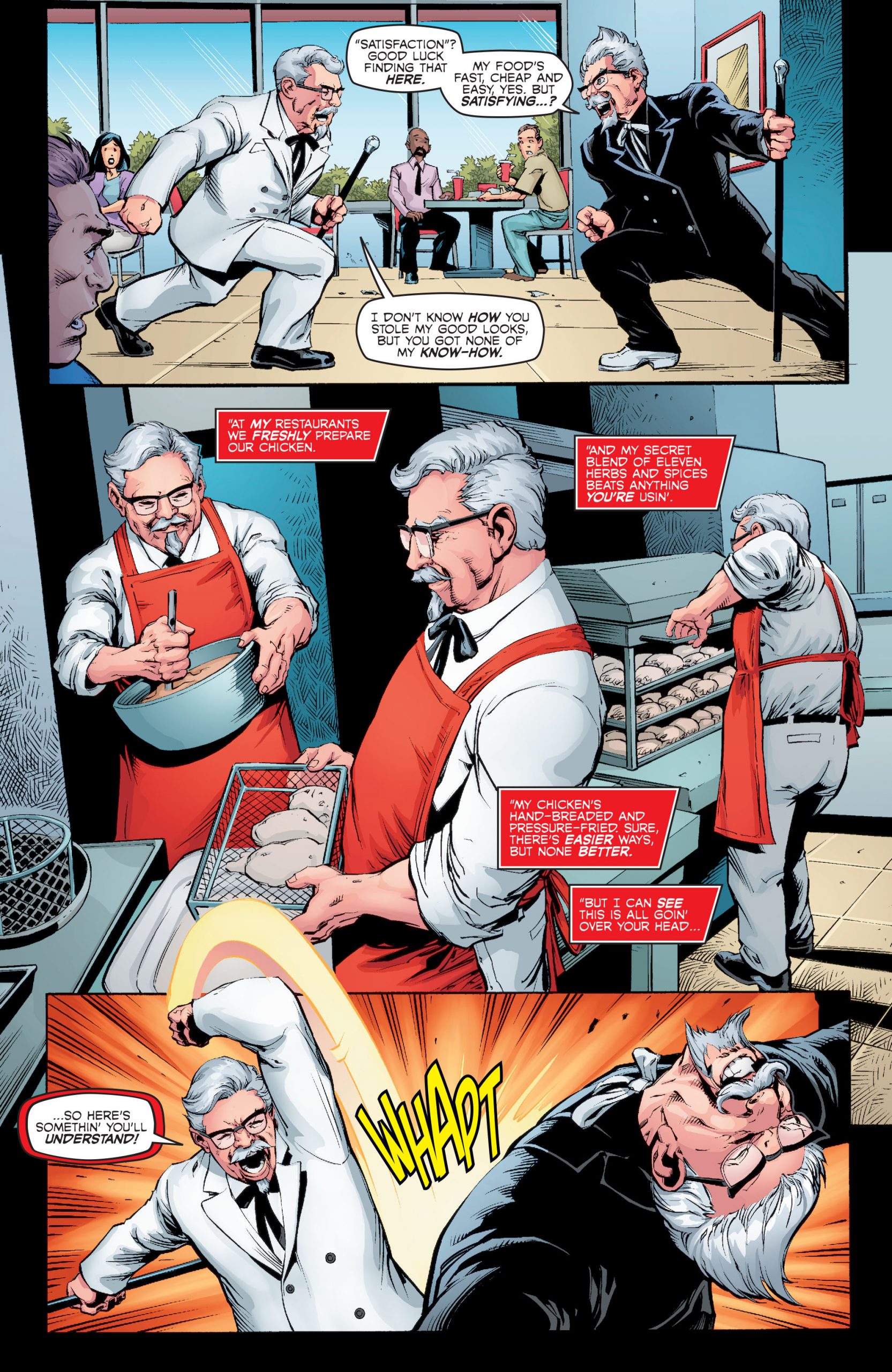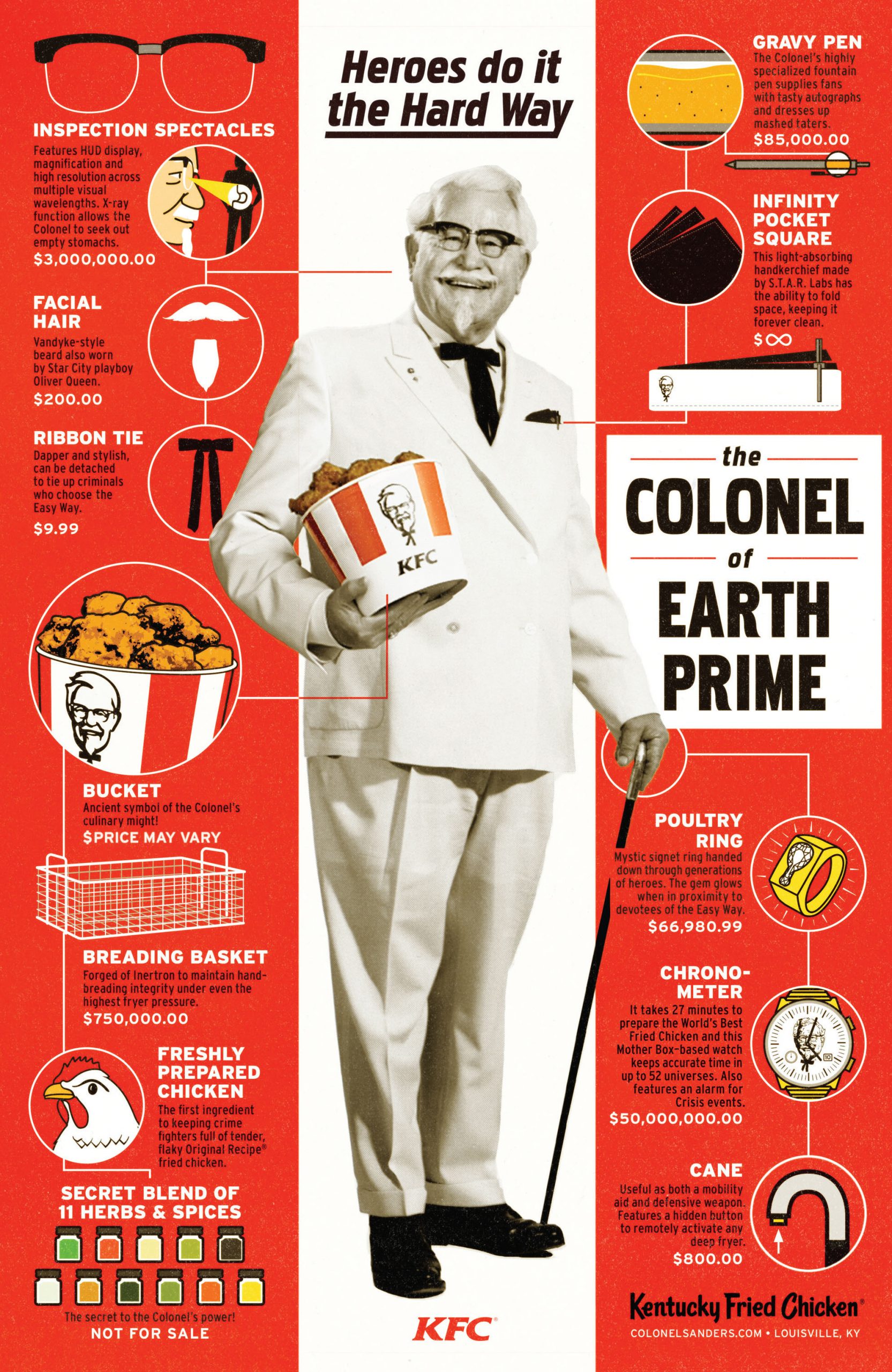 Hay que aclarar que no se trata del primer cómic del Coronel Sanders publicado por DC, aunque sí el primero que se trata realmente de un crossover entre personajes de la editorial y de la cadena KFC. El primero era una breve historia sobre el súper poder del Coronel Sanders: cocinar pollo.