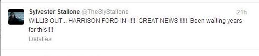 Justo el día de ayer les dimos a conocer sobre el sorpresivo abandono de Bruce Willis de Los Indestructibles 3, pues Sylvester Stallone sin más explicación, anunció en su cuenta de Twitter que el actor estaba fuera de la cinta, pero que en su lugar entraría Harrison Ford.