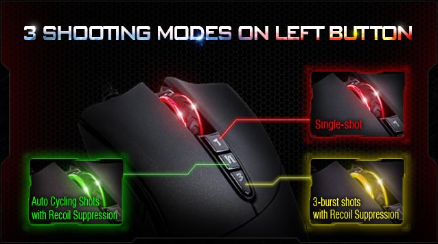 Hay tres núcleos en este precioso mouse, sumado a una completa experiencia sin lag y gracias también a su diseño especializado podemos ser los mejores en los FPS. Usando los tres botones debajo del scroll donde el “1” es usado para disparos normales, como es el arma sin modificaciones, el “N” es usado para disparar tiros dobles (2 rondas de disparo), y el “3” sirve para rondas de tres disparos.