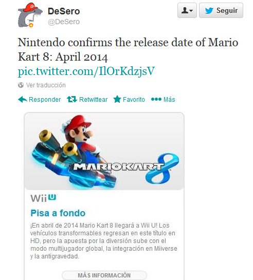 Este rumor se une a una publicación en Twitter del usuario “De-Sero”. que señala a abril como el mes de lanzamiento del esperado Mario Kart 8. Sólo el tiempo y Nintendo confirmarán si este rumor es cierto.