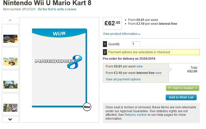 Nintendo confirmó que habrá un paquete que tendrá un Wii U de 32 GB, Mario Kart 8 y además un Wiimote Plus y una Wii Wheel. Eso no es todo, ya que los compradores que adquieran Mario Kart 8 entre el 30 de mayo y el 31 de julio, obtendrán gratis un juego de Wii U; los que se ofrecen para América son The Legend of Zelda: The Wind Waker HD, New Super Mario Bros. U, Pikmin 3, Nintendoland, Monster Hunter 3 Ultimate, Sonic: Lost Word, Mario & Sonic at the Sochi 2014 Olympic Winter Games, Game & Wario o Wii Party U.