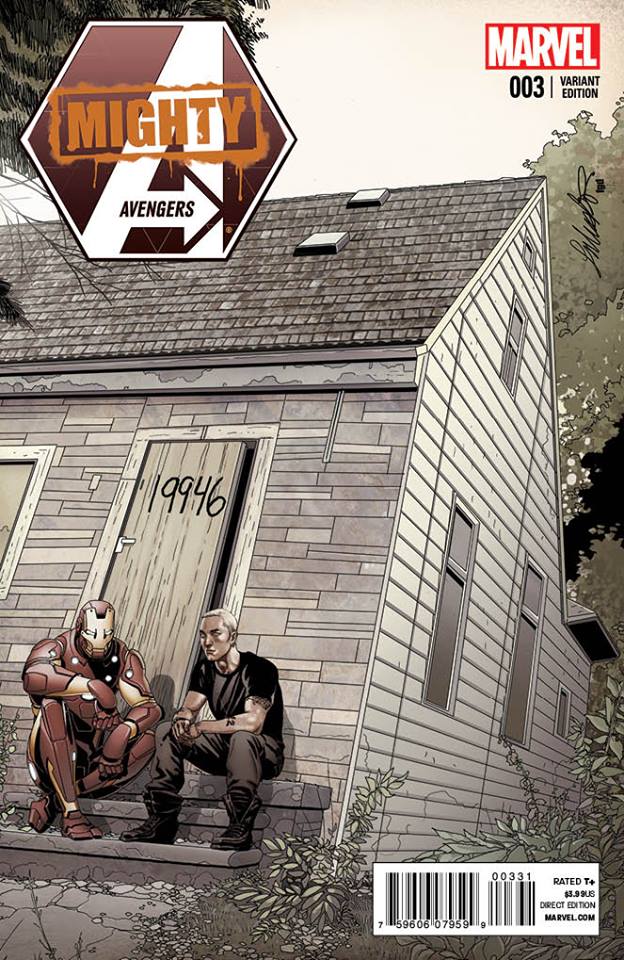 Pues aunque pueda parecernos un movimiento más que extraño, Eminem aparece en la portada variante de Mighty Avengers #3 al lado de Ironman, ambos sentados en el pórtico de la casa en la que Marshall Mathers vivió durante su juventud y que sirvió de inspiración para la película 8 Mile y gran cantidad de canciones del autor.