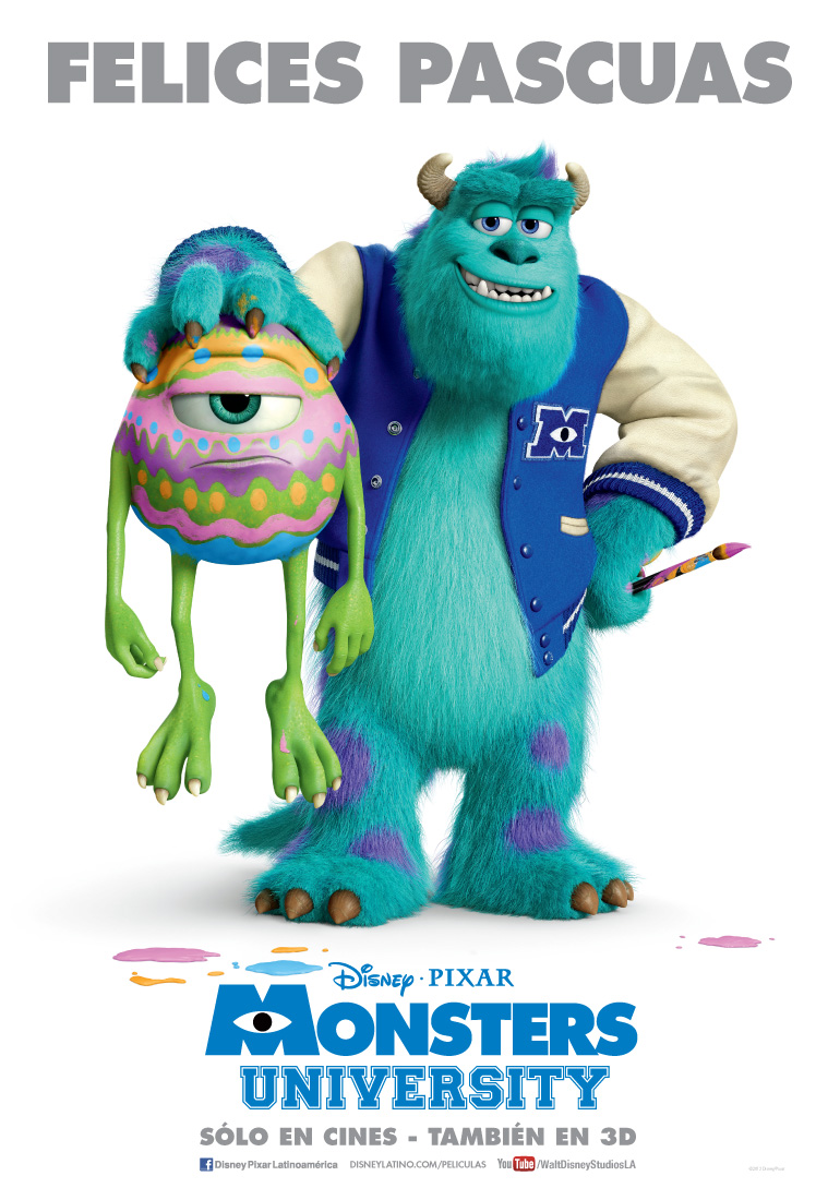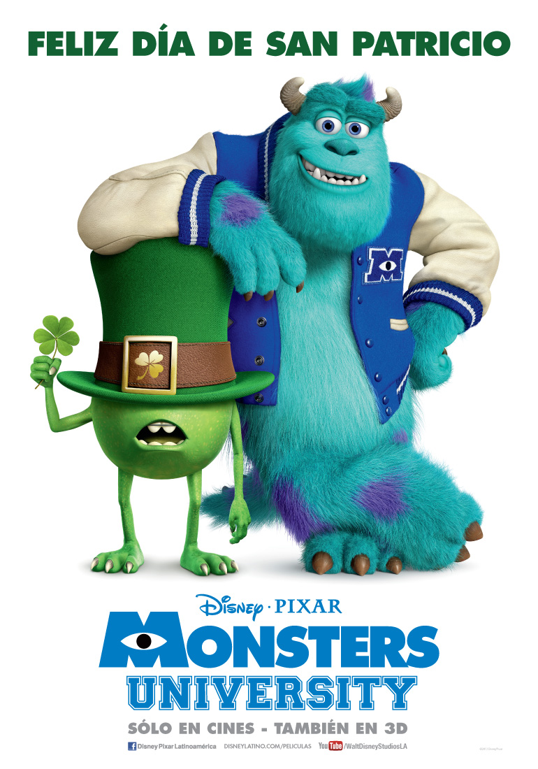 John Goodman, Billy Crystal, Steve Buscemi, Kelsey Grammer, Frank Oz y Dan Gerson forman parte del elenco que realizará el doblaje en inglés de Monsters University. A continuación te mostramos el nuevo póster mientras nos desean Felicides Pascuas, así como el cartel por el día Día de San Patricio. Monsters University se estrenará el 21 de junio.