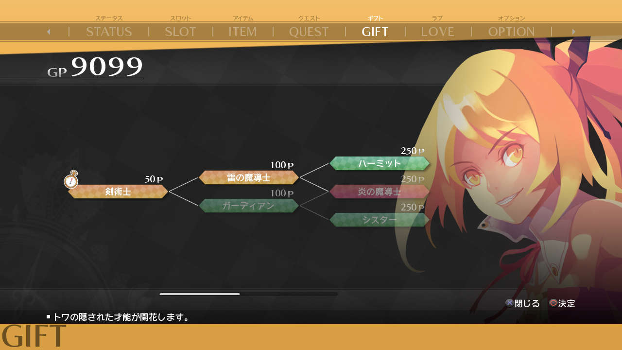 También podemos ver en las imágenes algunas de las pantallas de subida nivel y mapa de Toki to Towa, en donde podremos seleccionar entre ambas personalidades de nuestra protagonista según nos convenga. El desarrollo del título es cual si fuera un anime, a manera de capítulos y con animación en alta definición, toma de decisiones y caminos que revearlán distintas posibilidades (y nuevas animaciones). Los fondos son pre rendereados en 3D con personajes en 2D cual si fuera caricatura. Está pensado que incluya un sistema de batallam aunque aún no liberan detalles ni imágenes al respecto.