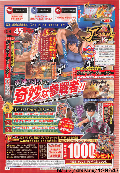 La revista Jump reveló nuevos personajes para J-Stars Victory Vs, el videojuego de peleas crossover con varios personajes de anime y manga para PlayStation 3 y PS Vita realizado por Bandai Namco.