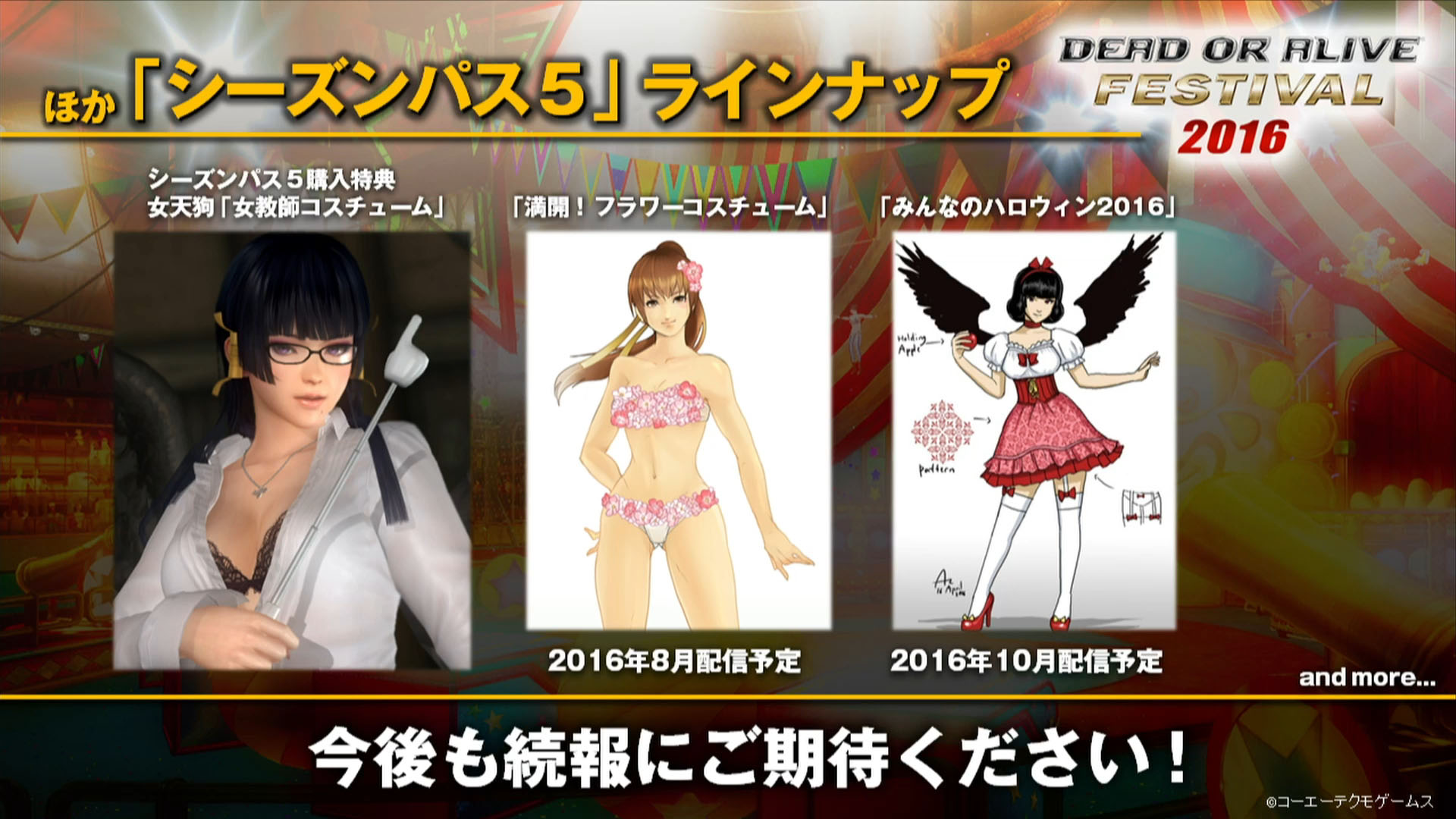 Estos contenidos podrán comprarse por separado o bien como parte del Pase de Temporada 5 de Dead or Alive 5: Last Round; quienes adquieran el pase tendrán acceso además a los trajes Lady Teacher, Full Boom Flower y Everyone’s Halloween, a partir de agosto.
