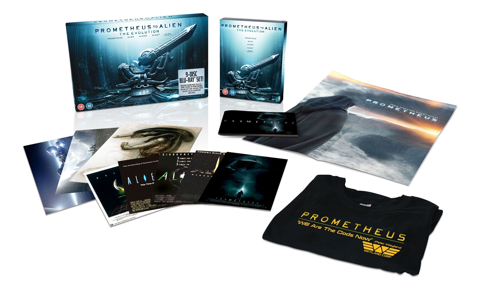 El paquete lo complementa un poster exclusivo de la película de 2012, una serie de tarjetas con los pósteres originales de las películas y algo de arte adicional, el libro de arte de Prometeo-que muestra todo el arte conceptual y de pre-producción así como detalles de la trama-, y por último, una camiseta de la tripulación de la nave de Weyland.