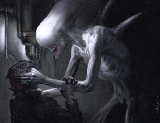 Dos militares (Vigoda y Card) investigan un fallo en el sistema de refrigeración de la nave. Acá vemos al xenomorfo completamente formado, y encontramos que es una especie de mezcla pacheca entre el xenomorfo clásico, Twelve de Street Fighter III y el T-1000, ya que tiene la habilidad de volverse líquido y cambiar de forma. Lo describen como “un humanoide con brazos largos y delgados, espalda espinosa, invertebrado, flexible y monstruosamente fuerte, con una cola de anguila, y cabeza plana y abombada como de delfín”. Su boca expulsa mandíbulas más largas (como el xenomorfo “diácono” que vimos al final de Prometeo, claro).