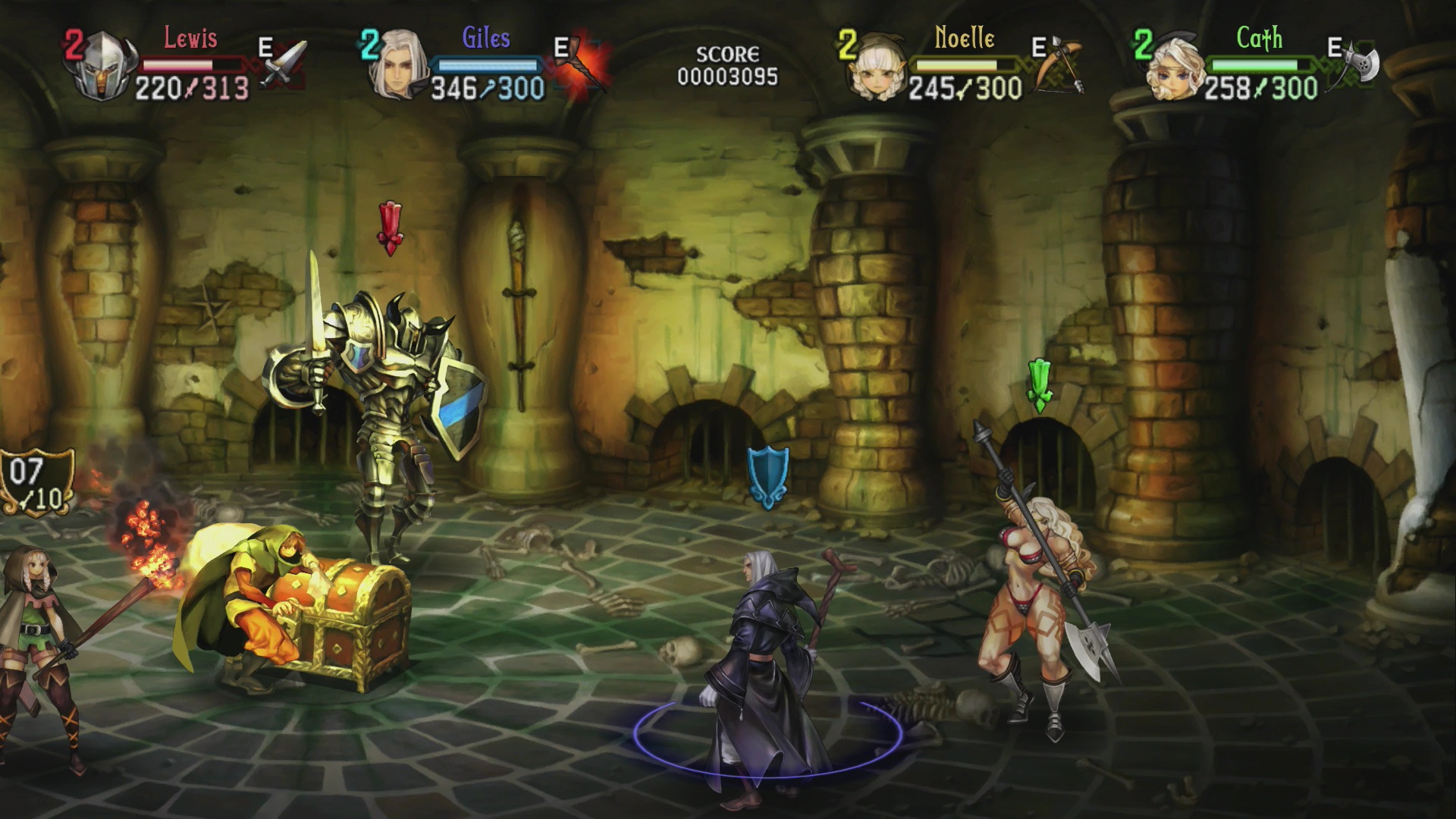 Este modo cooperativo sirve tanto de manera local como en línea. En casa puedes simplemente crear un personaje para cada uno de los compañeros que te asistan, o bien conectarte a Internet una vez que hayas desbloqueado esta opción. Si no tienes amigos o aún no avanzas lo suficiente en la historia, Dragon’s Crown te ofrece la posibilidad de recolectar los cadáveres de guerreros cáidos para más tarde resucitarlos. Los personajes controlados por la computadora no suben de nivel y a veces son algo torpes a la hora de esquivar obstáculos, pero siempre podrás encontrar huesitos de mayor nivel para invocar a un aliado más poderoso.