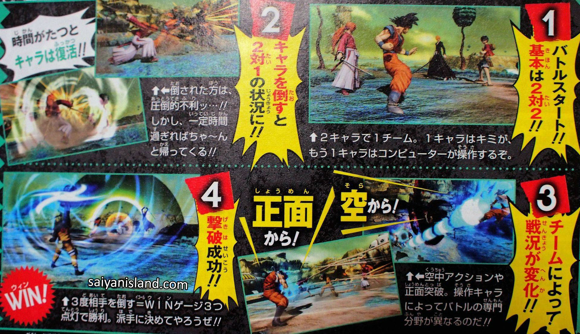 Primero que nada, J-Stars Victory Vs será un título de combates en parejas, con un jugador controlando a un personaje y la computadora haciéndose cargo del otro si no hay un segundo jugador humano. Si un jugador es noqueado, se levantará después de cierto tiempo, pero mientras tanto se volverá una batalla de dos contra uno. Gana el equipo que llene tres veces su barra de victoria, lo que equivale a realizar tres nocauts.