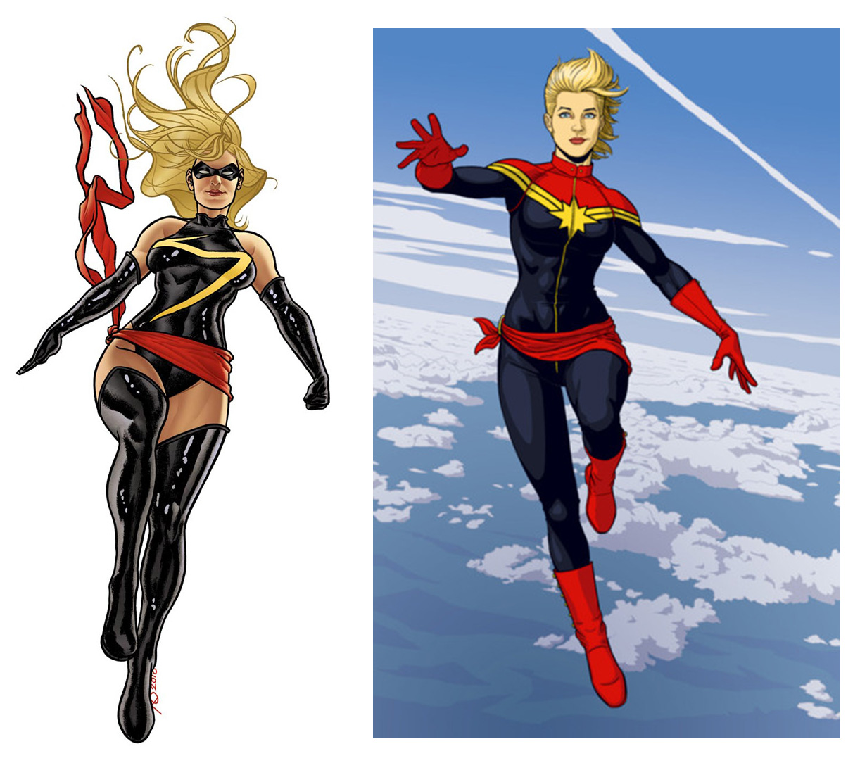 Aunque no había nada agresivamente mal en cuanto al longevo disfraz clásico Ms. Marvel -pienso que un bañador de una pieza y unas botas largas son algo ridículo para usar cuando uno lucha contra el crimen- el diseño actualizado es lo que necesitaba junto a su cambio de nombre. Kelly SueDeConnick pagó a Jamie McKelvie el rediseño y a Marvel le gustó.